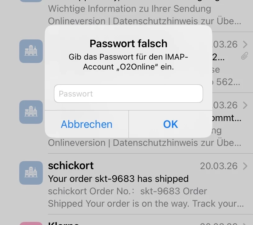Solveig es war aber Möglich. Es geht um 02 Email Account. E-Mail geprüft Passwort geändert. Trotzdem geht es nicht alle Einstellungen geprüft. Passwort falsch. Weiß nicht was noch machen kann. Habe IPhone XR