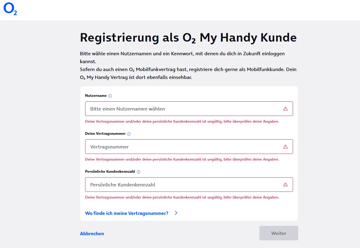 Ich will mich bei o2 myHandy registrieren. PKK und Vertragsnummer habe ich mir beides sicherheitshalber nochmal vom Kundenservice nachträglich zusätzlich bestätigen lassen. Vertrag des Geräts läuft noch. Es ist, so weit ich weiß, alles wie es sein muss, jedoch sobald ich mich registrieren will kommt die Fehlermeldung (siehe Bild).