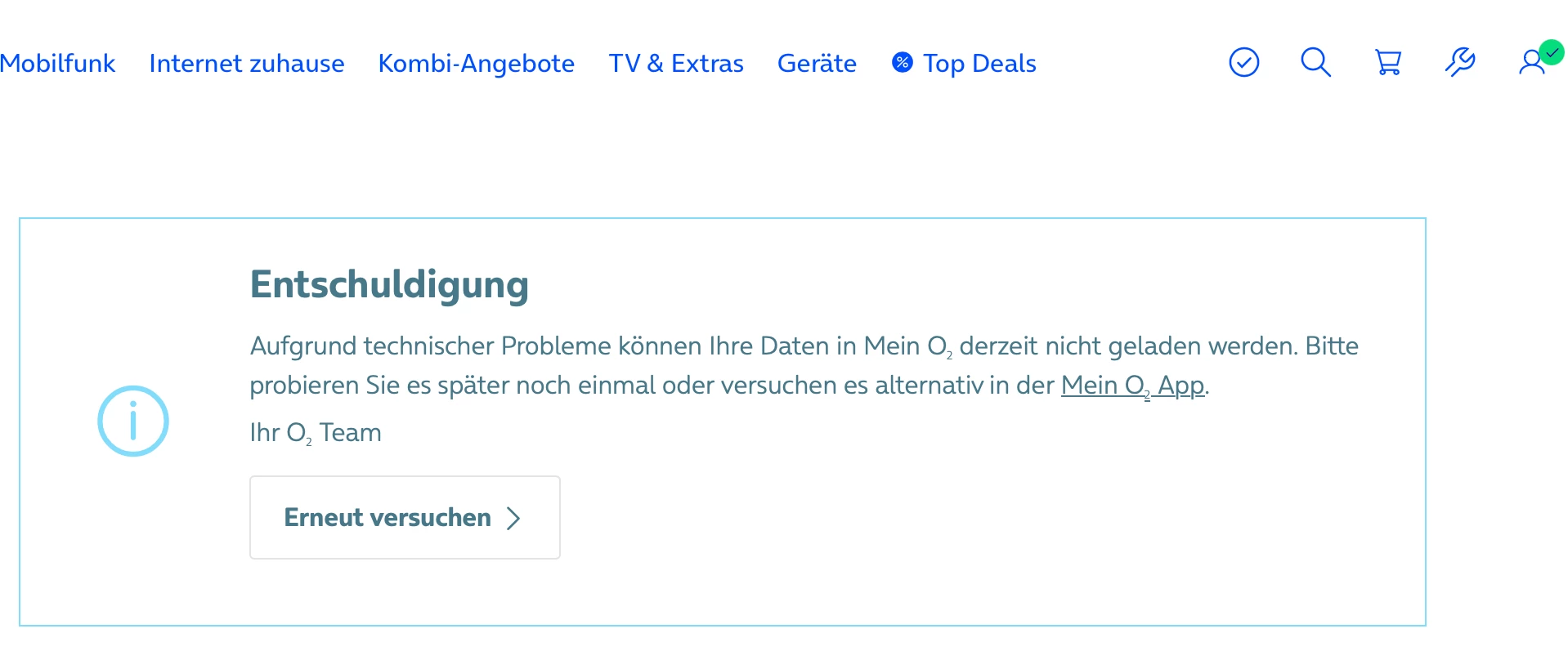 Aufgrund technischer Probleme können Ihre Daten in Mein O2 derzeit nicht geladen werden. Bitte probieren Sie es später noch einmal oder versuchen es alternativ in der Mein O2 App.