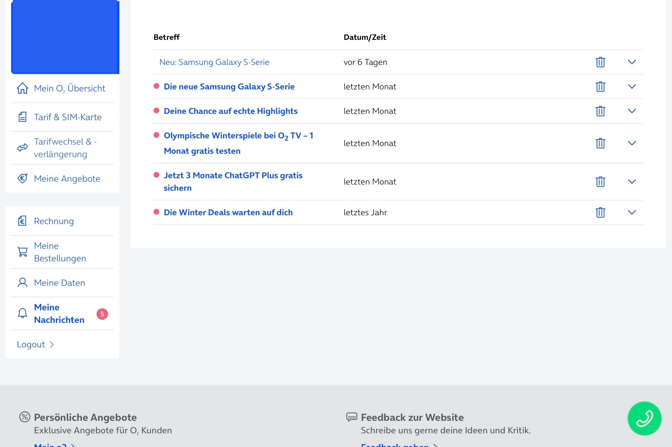 In mein meinO2 sind im Mitteilungsordner 6 Nachrichten kann nicht zugreifen da ausgegraut.