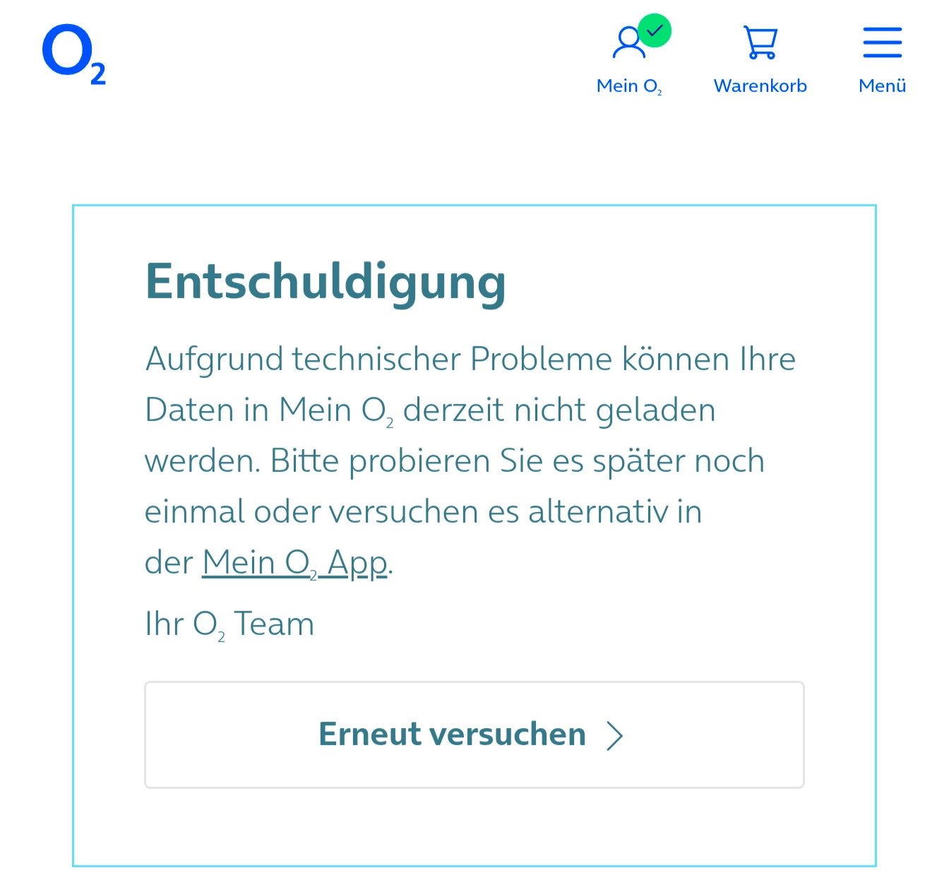 Ich komme seit Monaten(!) nicht mehr in mein O2 Konto, weder in der App noch auf der Webseite, wo angeblich Technische Störungen herrschen und man erneut versuchen soll ...... Sehr witzig!