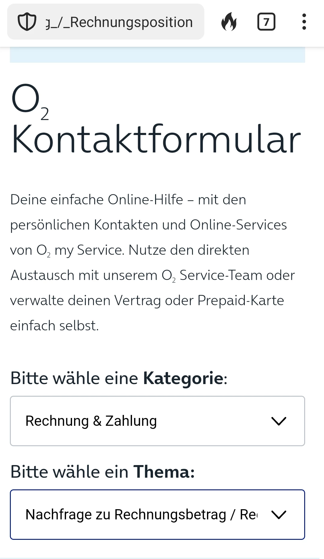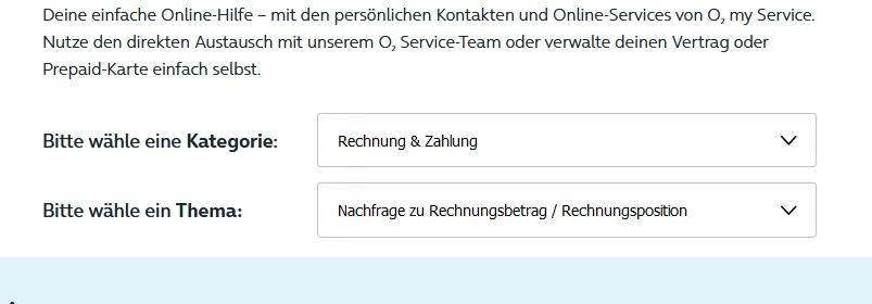 o2 anstelle des automatisierten Kundenformulars per KI, dass schnell, leicht zu einem unerwünschten Ergebnis führt, weil die Auswahl der Kategorie, des Themas etc. nicht gelingt, um erfolgreich zu kommunizieren und eine Nachricht zu verfassen, Dokumente hochzuladen usw.