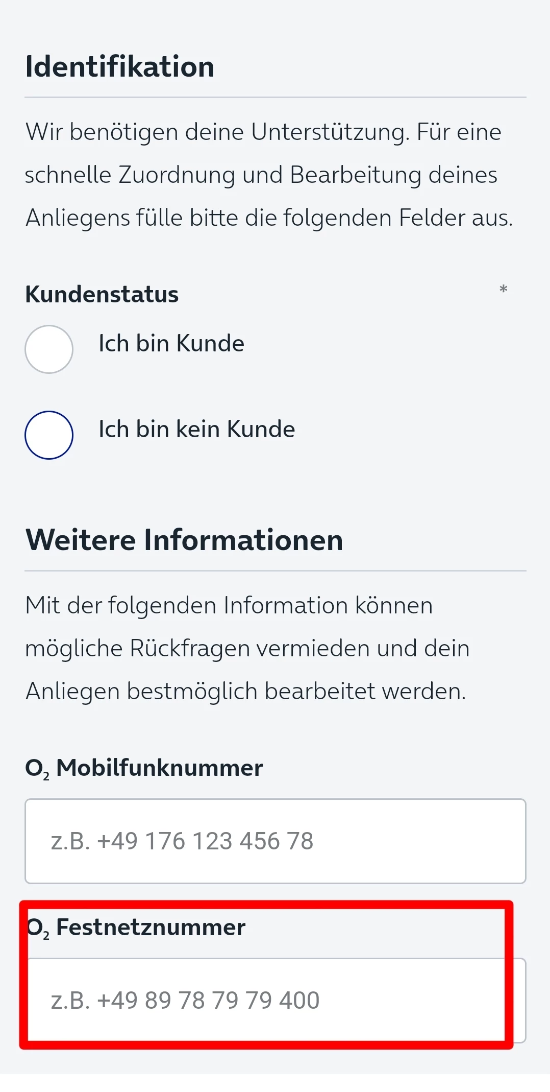 Zunächst trage ich nur eine Festnetznummer mit Text, Kunde etc. in das Kontaktformular ein. Ein Absenden ohne Mobilfunknummer gelingt nicht, sodass ich eine o2 hausinterne Mobilfunknummer 0176 88 81 47 77 eintrage und das Absenden arbeitet.
