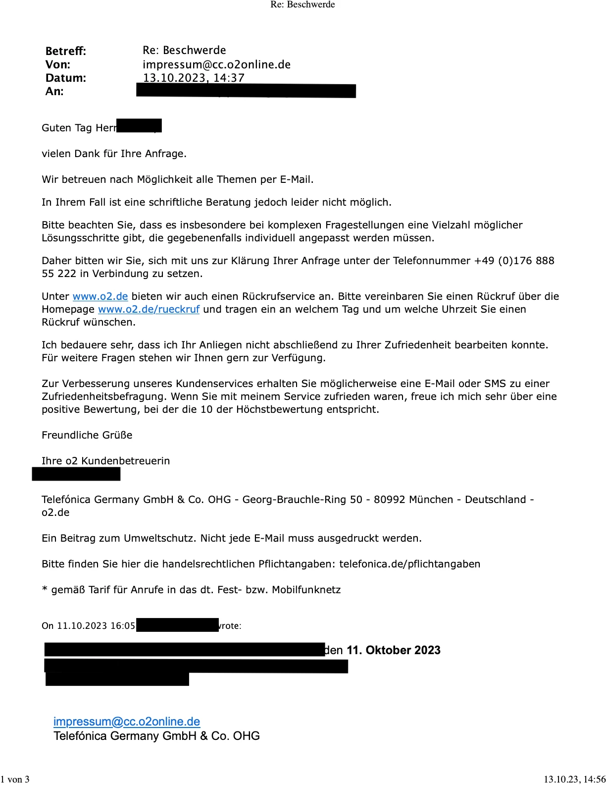 Auch schreibe ich über die in 12.5 AGB genannte E-Mail-Adresse impressum@cc.o2online.de eine Beschwerde an die Kundenbetreuung, die auf den Geschäftbrief in der Sache nicht antwortet: „Wir betreuen nach Möglichkeit alle Themen per E-Mail. In Ihrem Fall ist eine schriftliche Beratung jedoch leider nicht möglich. Daher bitten wir Sie, sich mit uns zur Klärung Ihrer Anfrage unter der Telefonnummer +49 (0)176 888 55 222 in Verbindung zu setzen.“ Hier antwortet Aura‘, die virtuelle Assistenz usw.