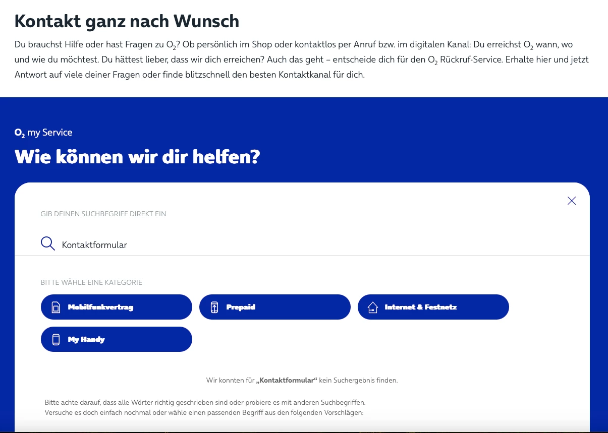 Wer die Prozedur, die Webseite ‘Kontaktformular’ (aus Erfahrung) - zunächst Scrollen, kennt, erreicht jene Webseite zukünftig problemlos, jedoch z.B. gemäß meiner Auswahl sende ich - eingeloggt per Mein o2 - eine Nachricht ohne den Eintrag einer notwendigen Mobilfunknummer, nur mit der Eingabe einer Festnetznummer, E-Mail-Adresse als Kunde nicht ab. Ebenfalls erhalte ich keine Bestätigung, Kopie eines Eingangs der abgesandten Nachricht per Kontaktformular.