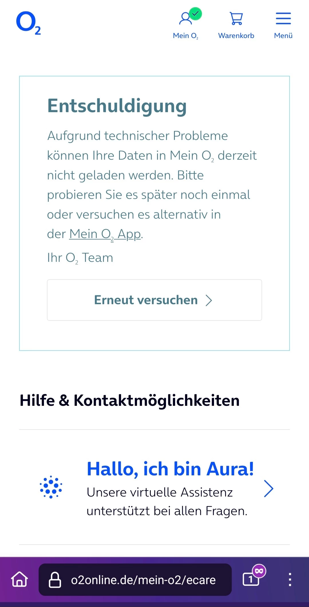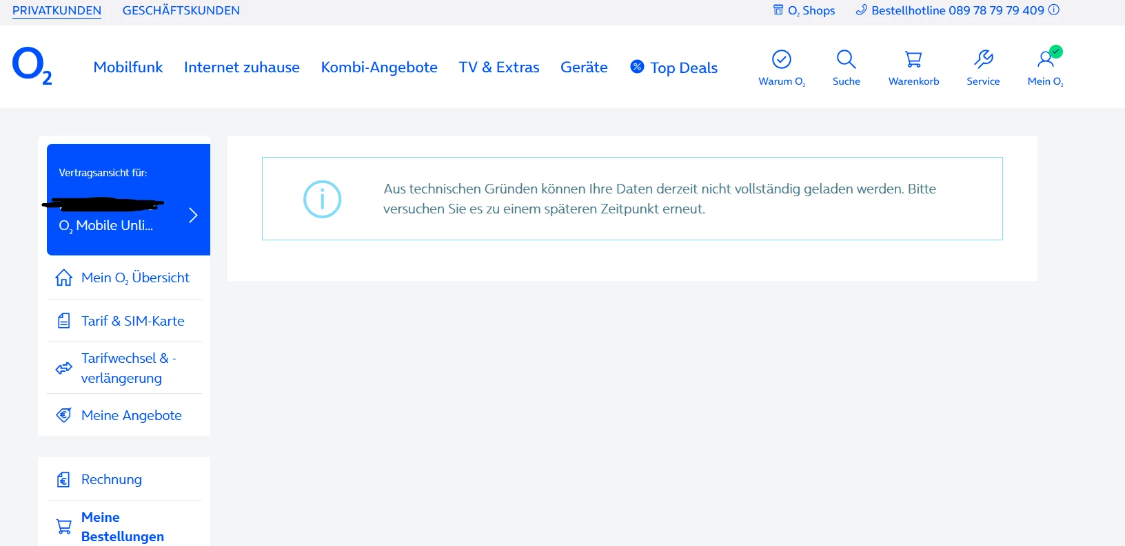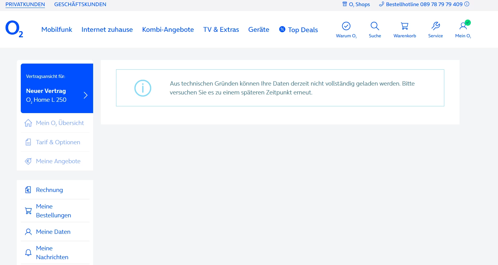 Weiterer technischer Fehler in “Mein o2 Bereich”