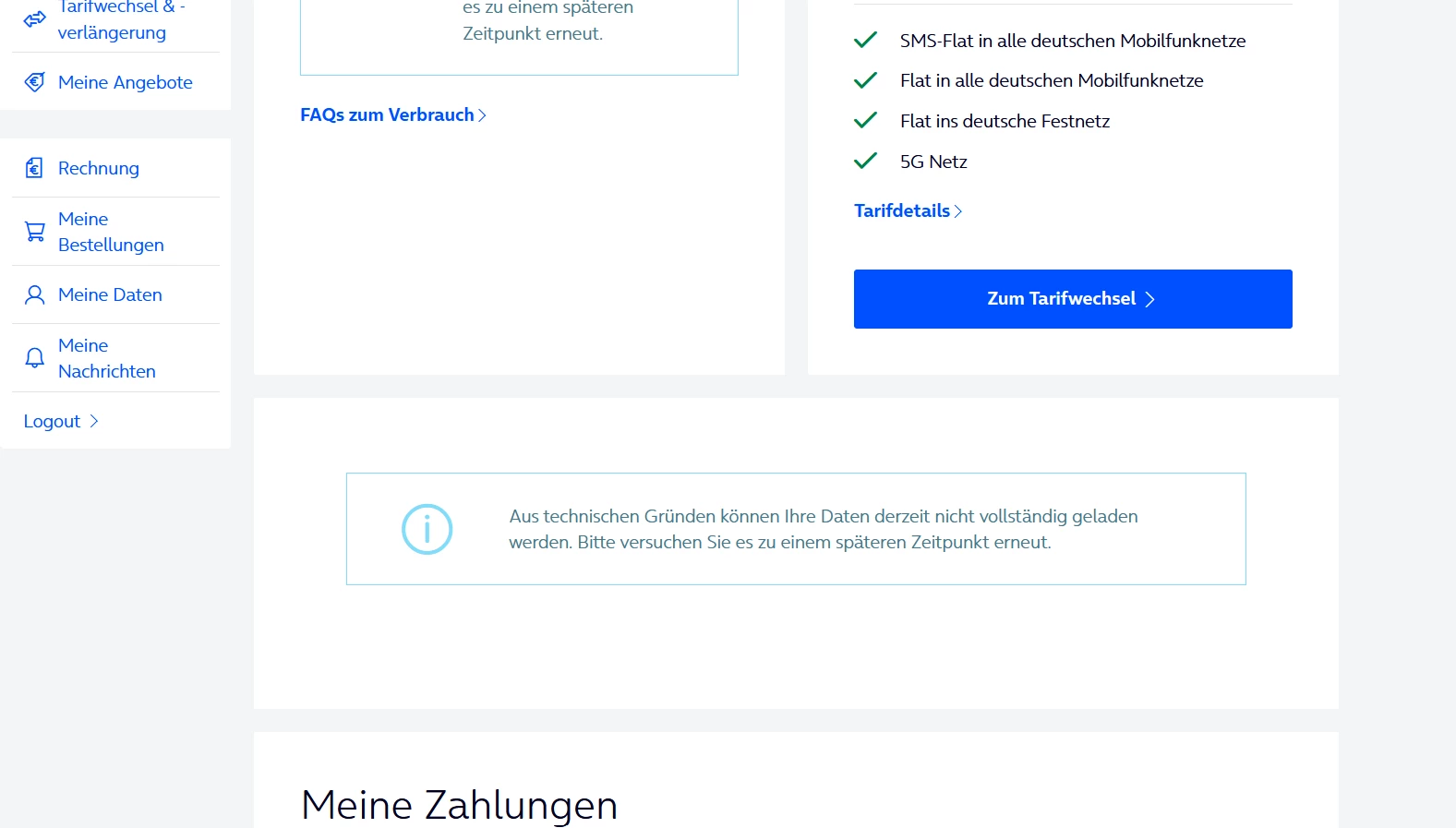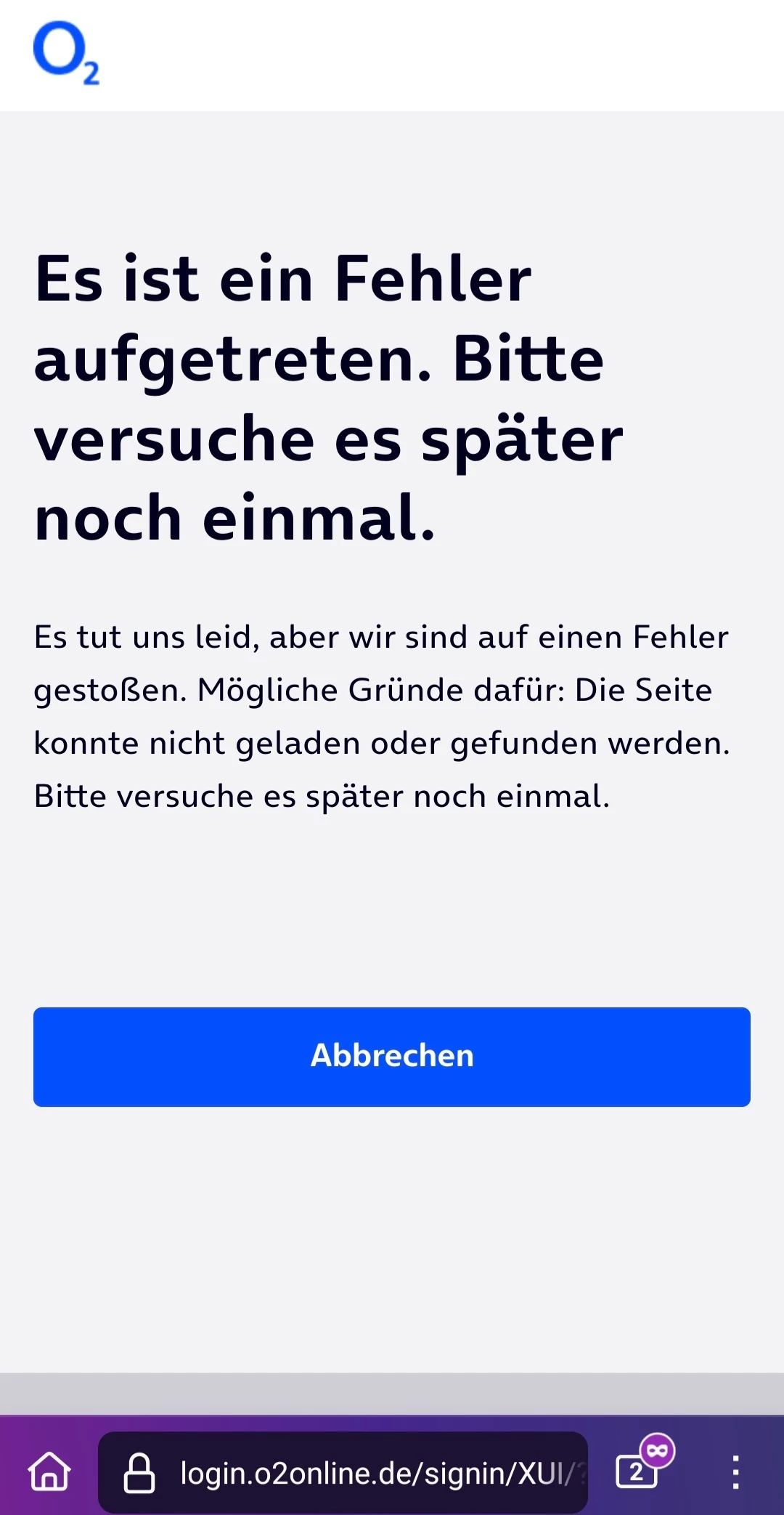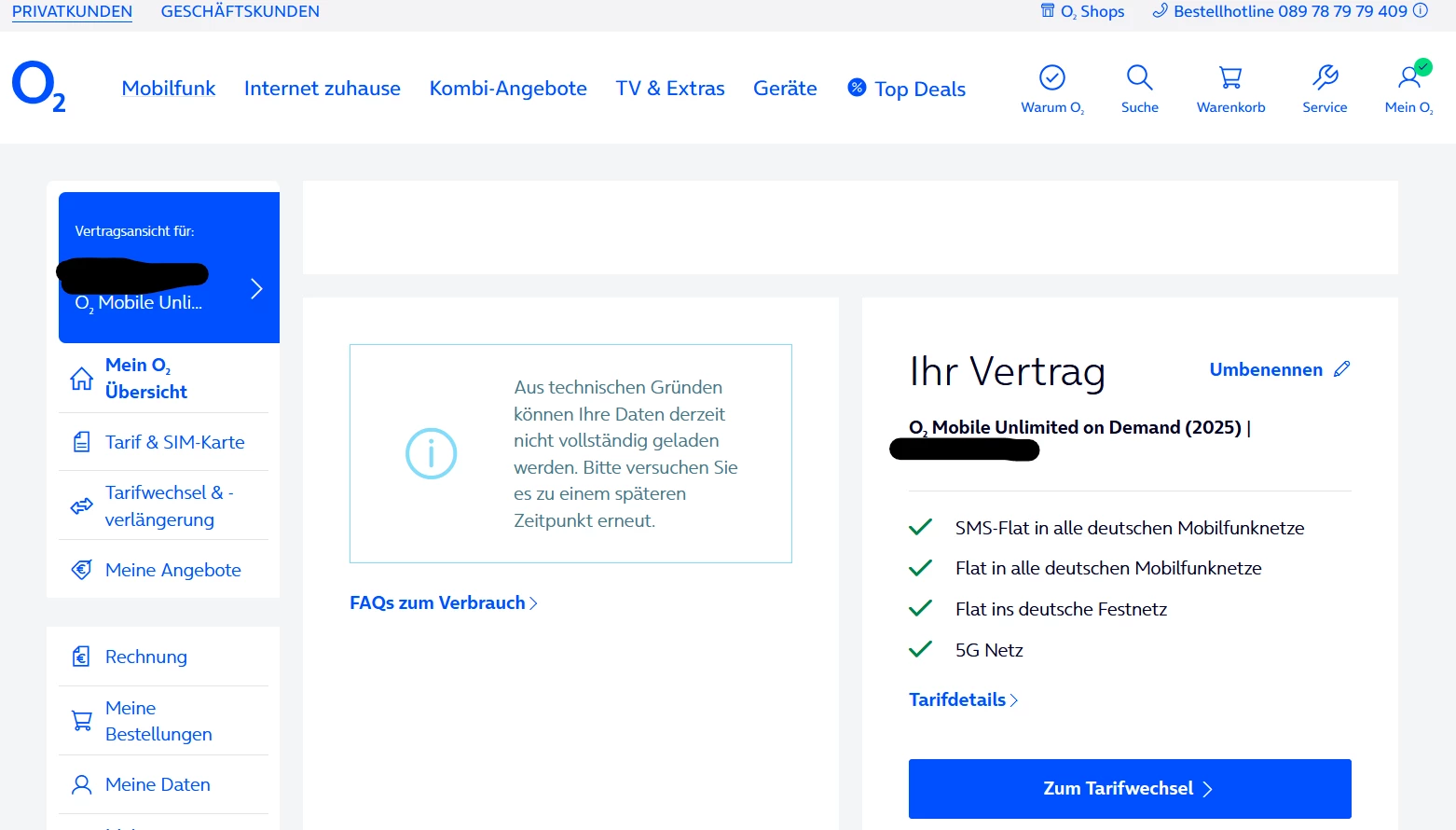 Weiterer technischer Fehler in “Mein o2 Bereich”