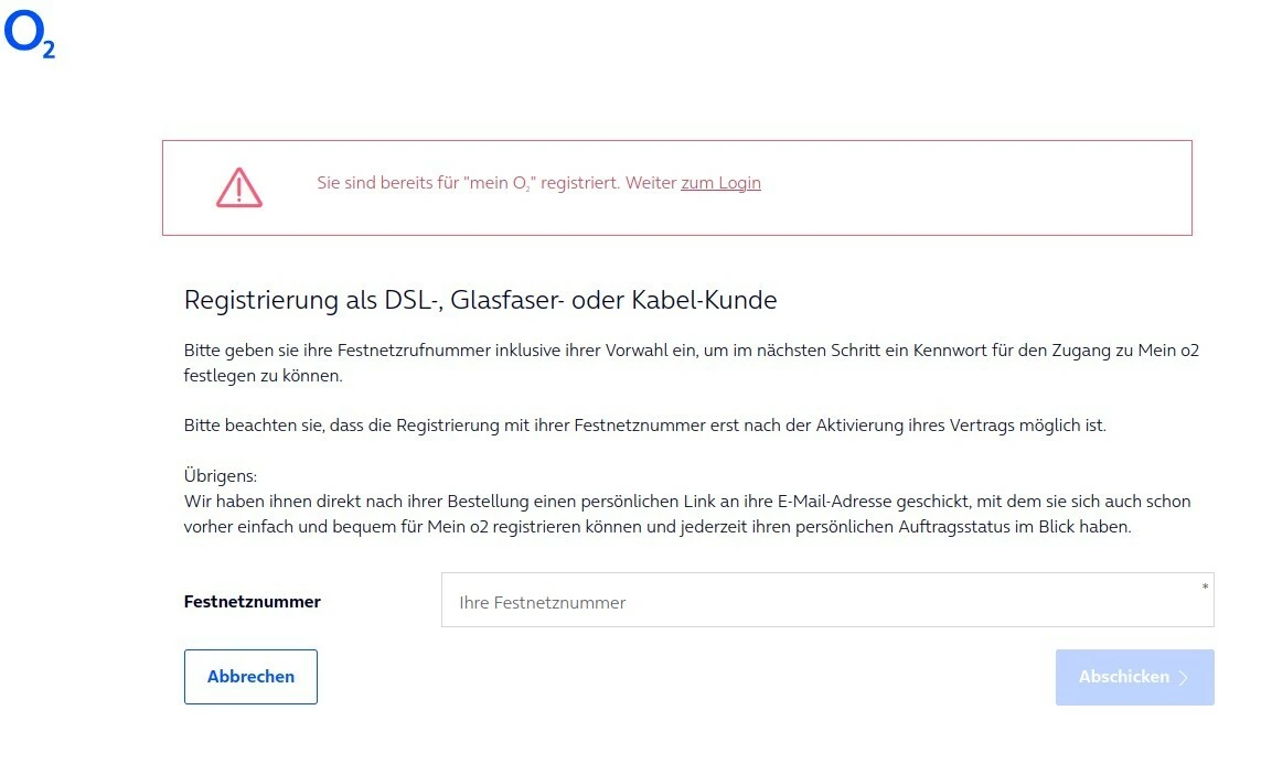 ich habe einen Glasfaser-Anschluss bei o2 beauftragt, der nächste Woche geschaltet werden soll. Die entsprechenden Unterlagen habe ich auch schon per Post bekommen. Ich hatte mir dafür im Rahmen der Bestellung einen neuen o2-Account angelegt und hatte mich in den letzten Wochen immer damit angemeldet, um den Auftragsstatus einsehen zu können. Hat bisher immer funktioniert.