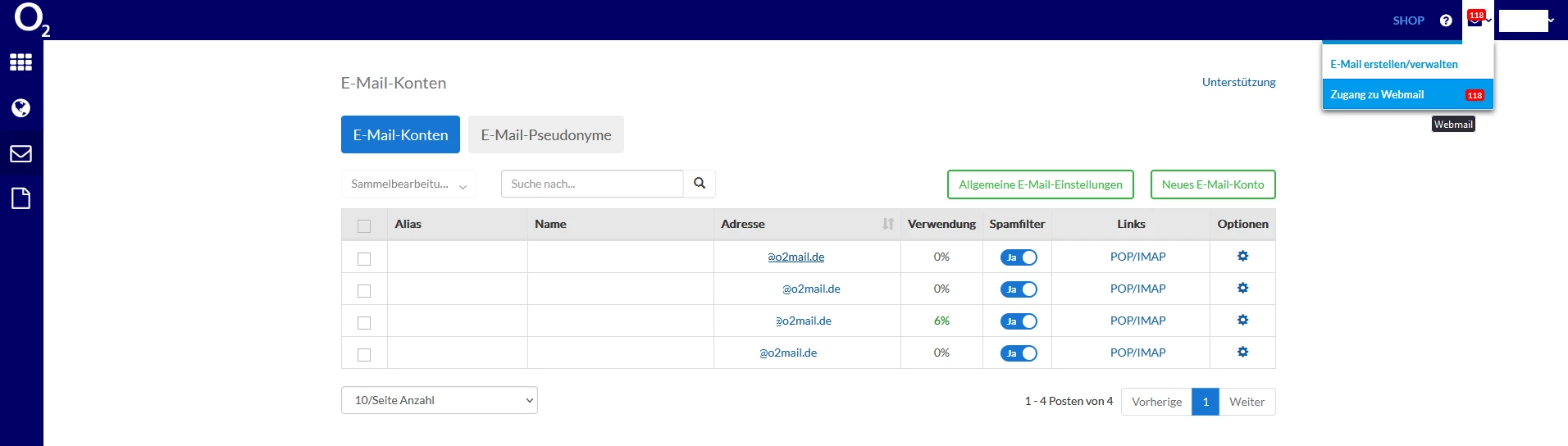 1. der  Zugang zu dem Adminportal geht?  zeigt aber keine  weiteren Alias/Mails an? https://admin.o2mail.de/ Ja, ich kann mich dort anmelden
