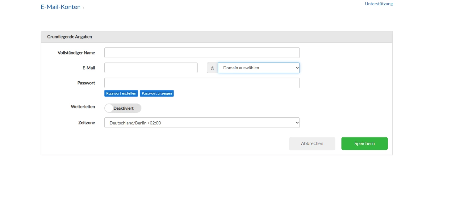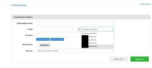 Wenn ich versuche eine neue Mailadresse anzulegen, geht das aber nicht ohne Domain. Klicke ich auf speichern, kommt immer die Meldung “Bitte wählen sie eine Domain aus”.