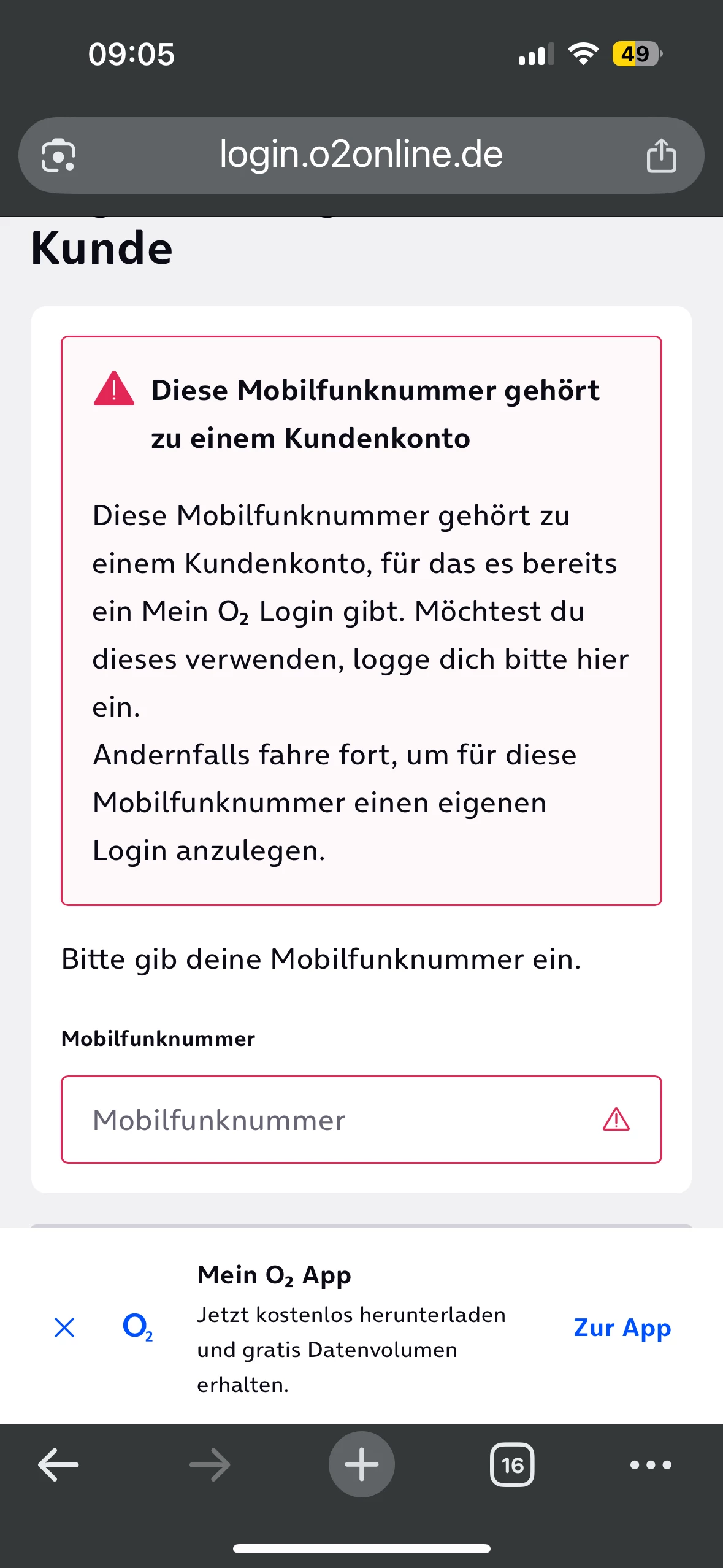 ich versuche mich mit meinen korrekten Mein O₂ Zugangsdaten in die Mein O₂ App einzuloggen, erhalte aber immer folgende Fehlermeldung: