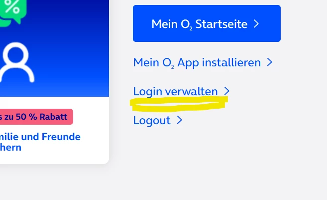 Ablauf: Nach Login im Mein o2 Portal auf unserer Webseite findest du rechts den Punkt Login verwalten