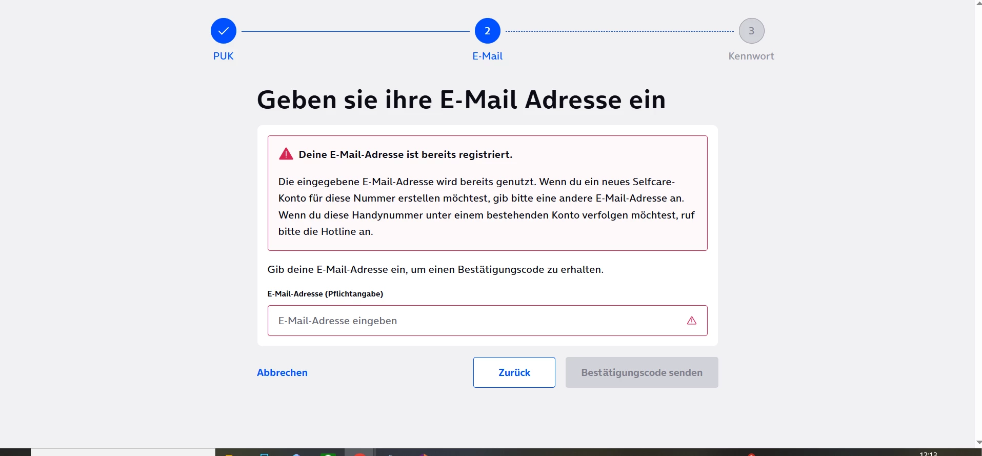 Ich habe im Kundencenter eine O2-Prepaid-Karte erworben und diese umgehend mittels meines Ausweises freischalten lassen. Alle Funktionen, einschließlich Anrufe und SMS, arbeiten problemlos. Die Mitarbeiterin im Kundencenter hat versucht, mich bei O2 zu registrieren. Der SMS-Code wird empfangen und die PUK sowie der Bestätigungscode per E-Mail können eingegeben werden, jedoch erfolgt beim Klicken auf Weiter (Bestätigen) immer eine Rückkehr zum Anfang des Fensters. Ich habe bereits fünf Versuche in verschiedenen Browsern wie Chrome, Firefox, Opera und Edge unternommen, den Cache und die Browserdaten sowie Cookies gelöscht, jedoch ohne Erfolg. Hat jemand eine Lösung?