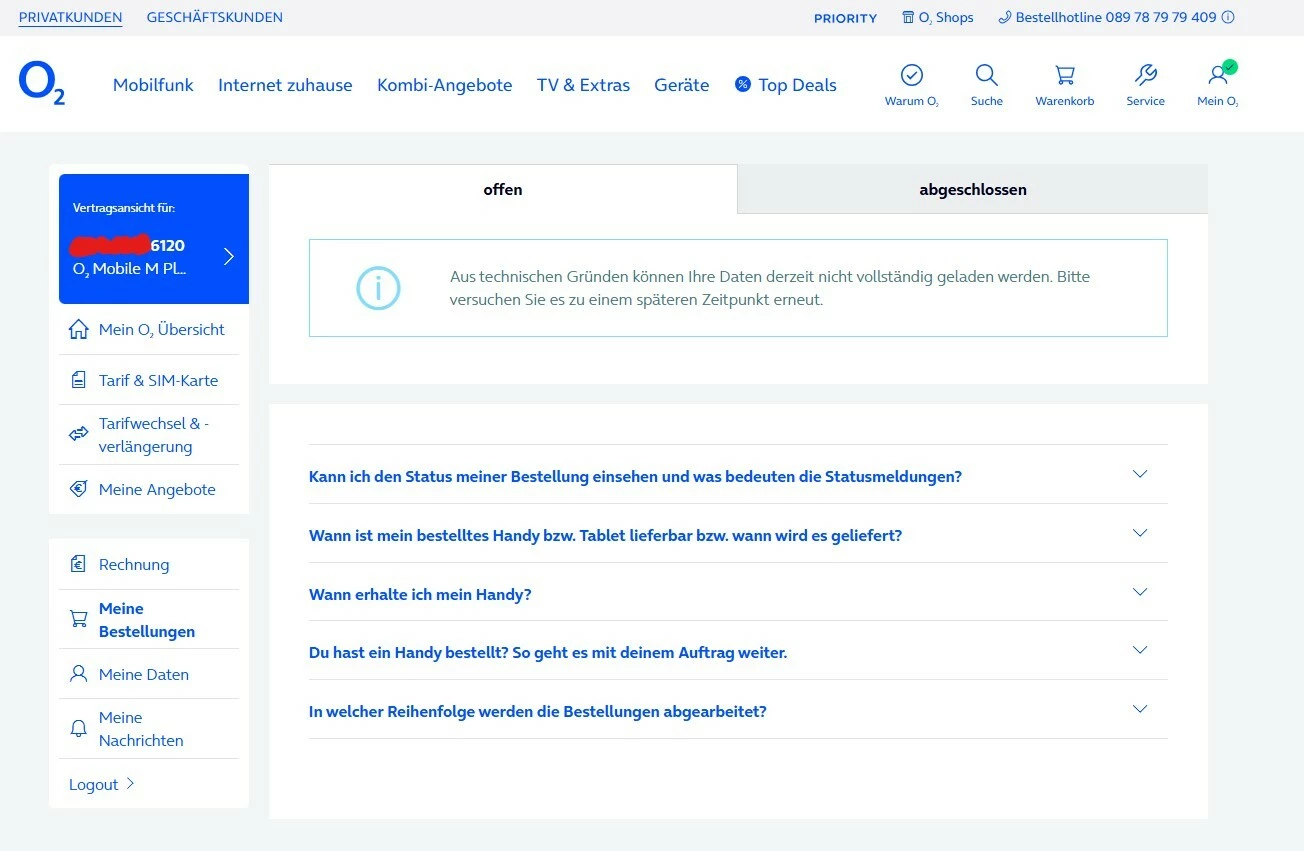 ich habe ein Problem mit dem O2-Kundenportal auf der Website. Jedes Mal, wenn ich unter "Meine Bestellungen" nachschaue, erscheint die Fehlermeldung: