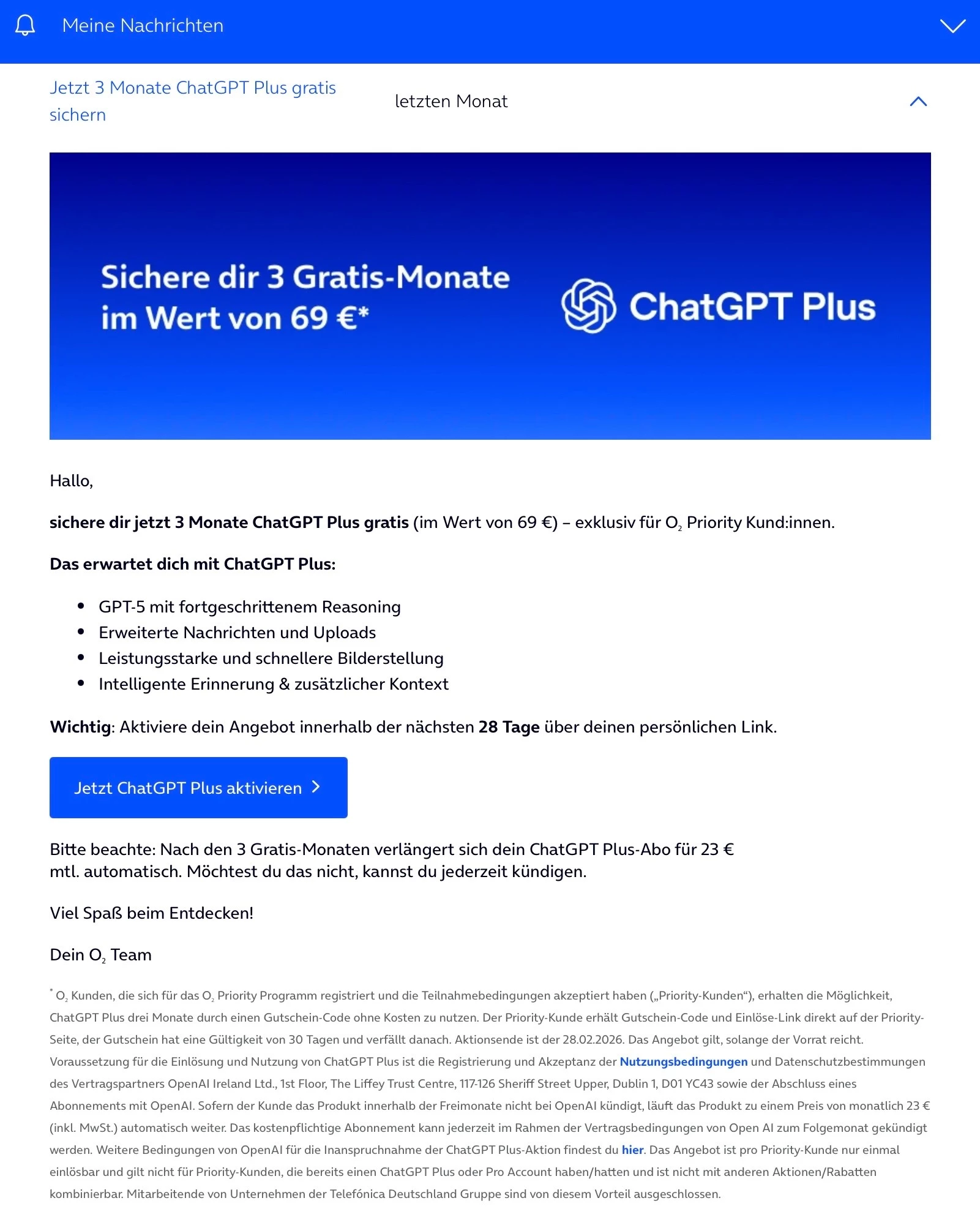 Unter “Meine Nachrichten” ist der Chatgpt+ Gutschein für drei Monate leider nicht mehr zu finden, als Beispiel.