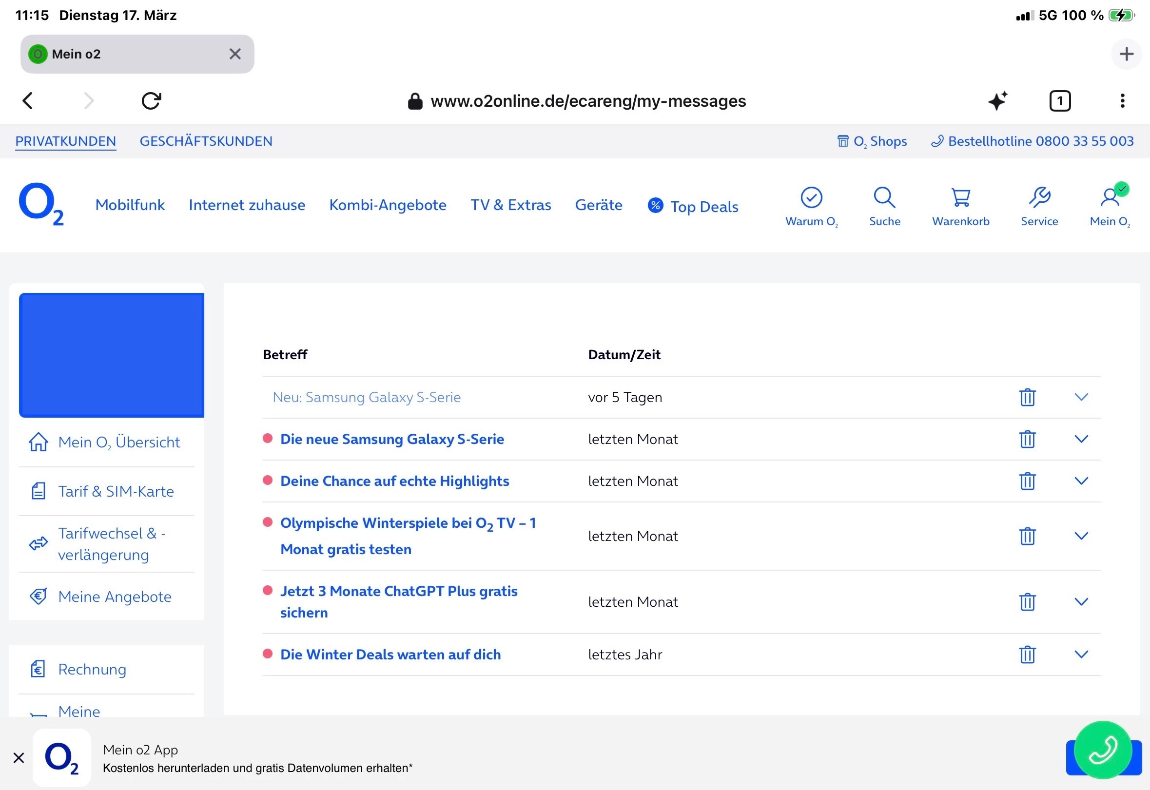 wenn ich mich in “Mein o2” einlogge und “meine Nachrichten” anklicke heißt es nun…