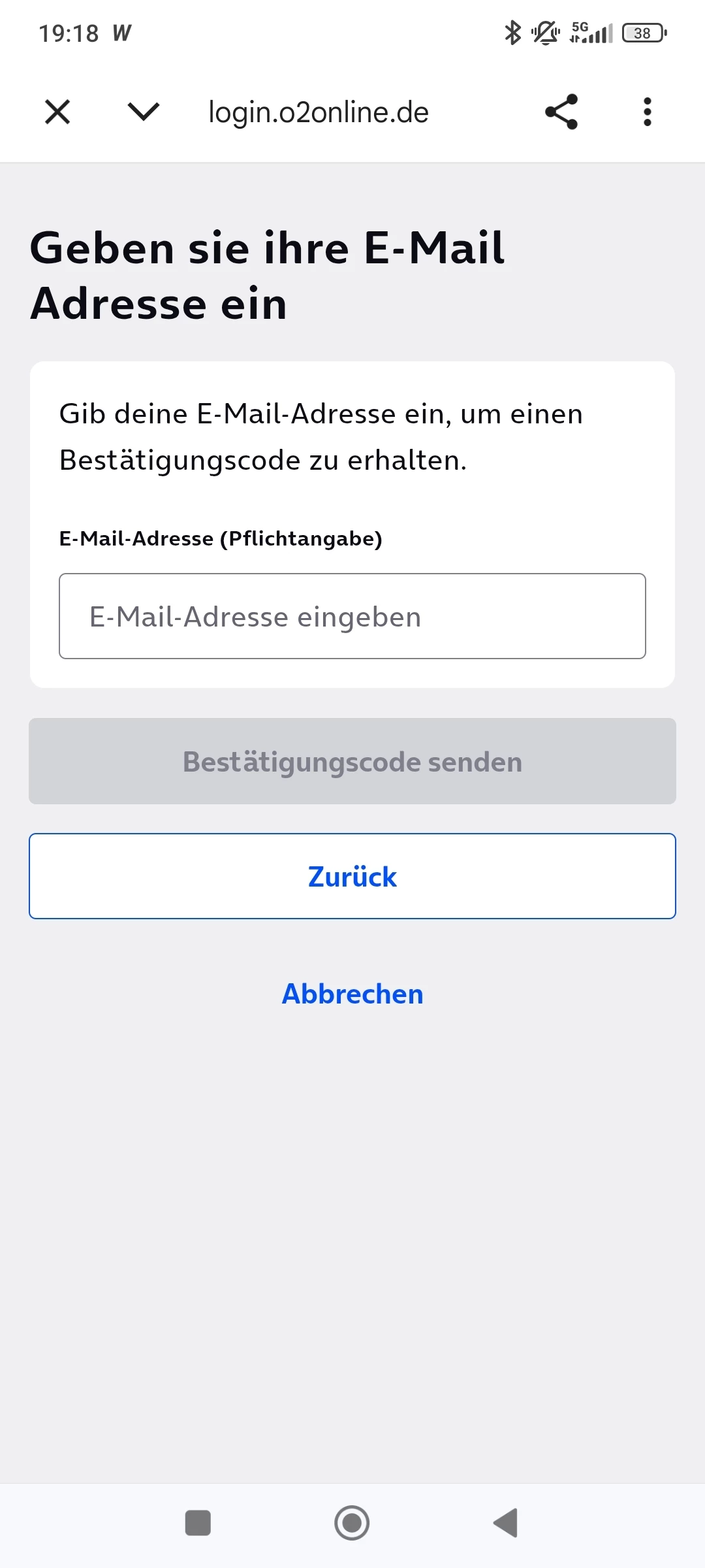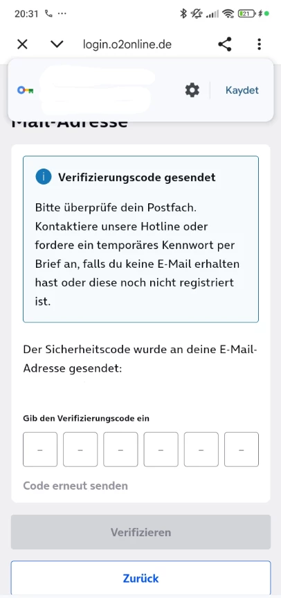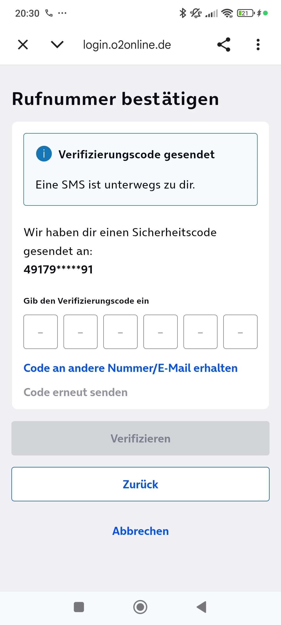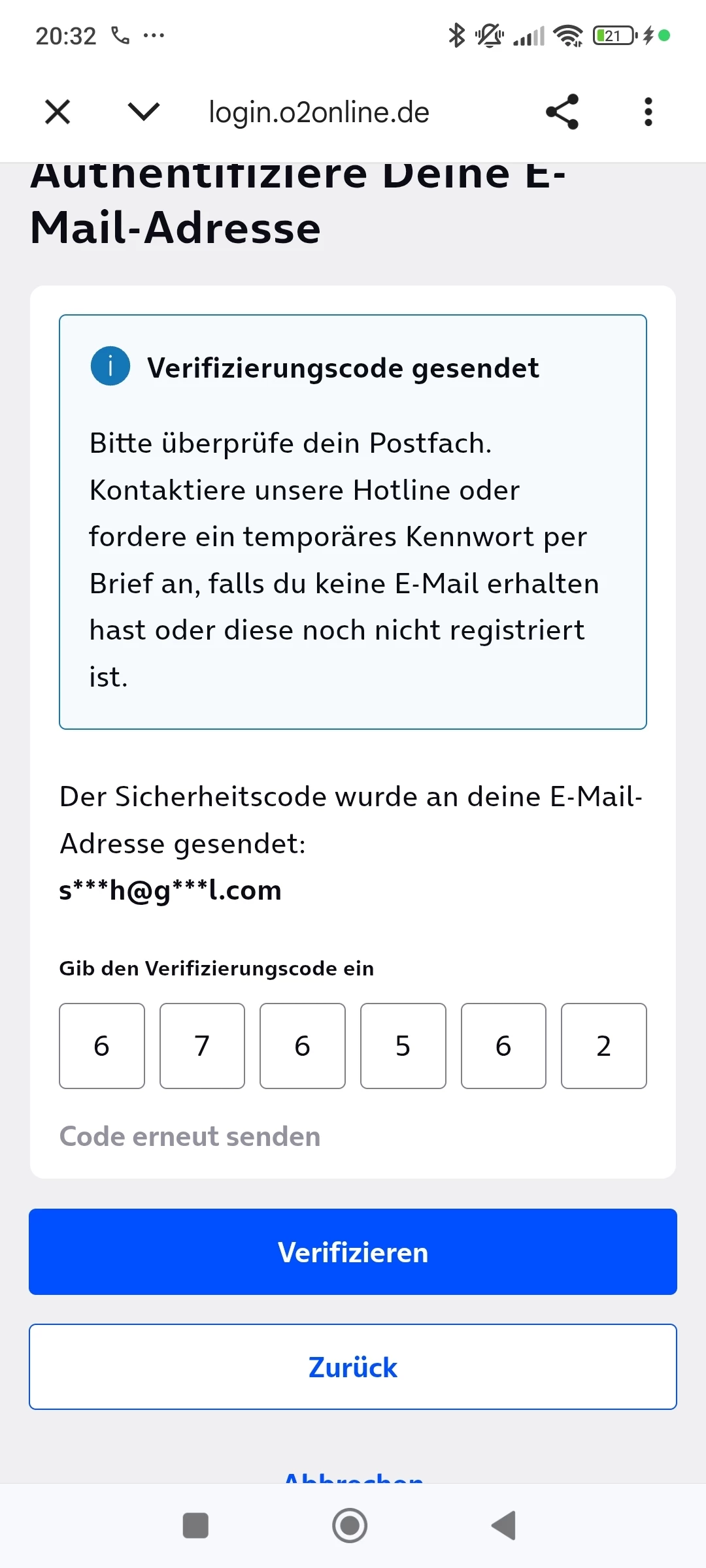 Nach dem SMS-Code bekomme ich einen Code per E-Mail. Wenn ich den Code eingebe, werde ich wieder auf die Startseite von O2 zurückgeleitet.“