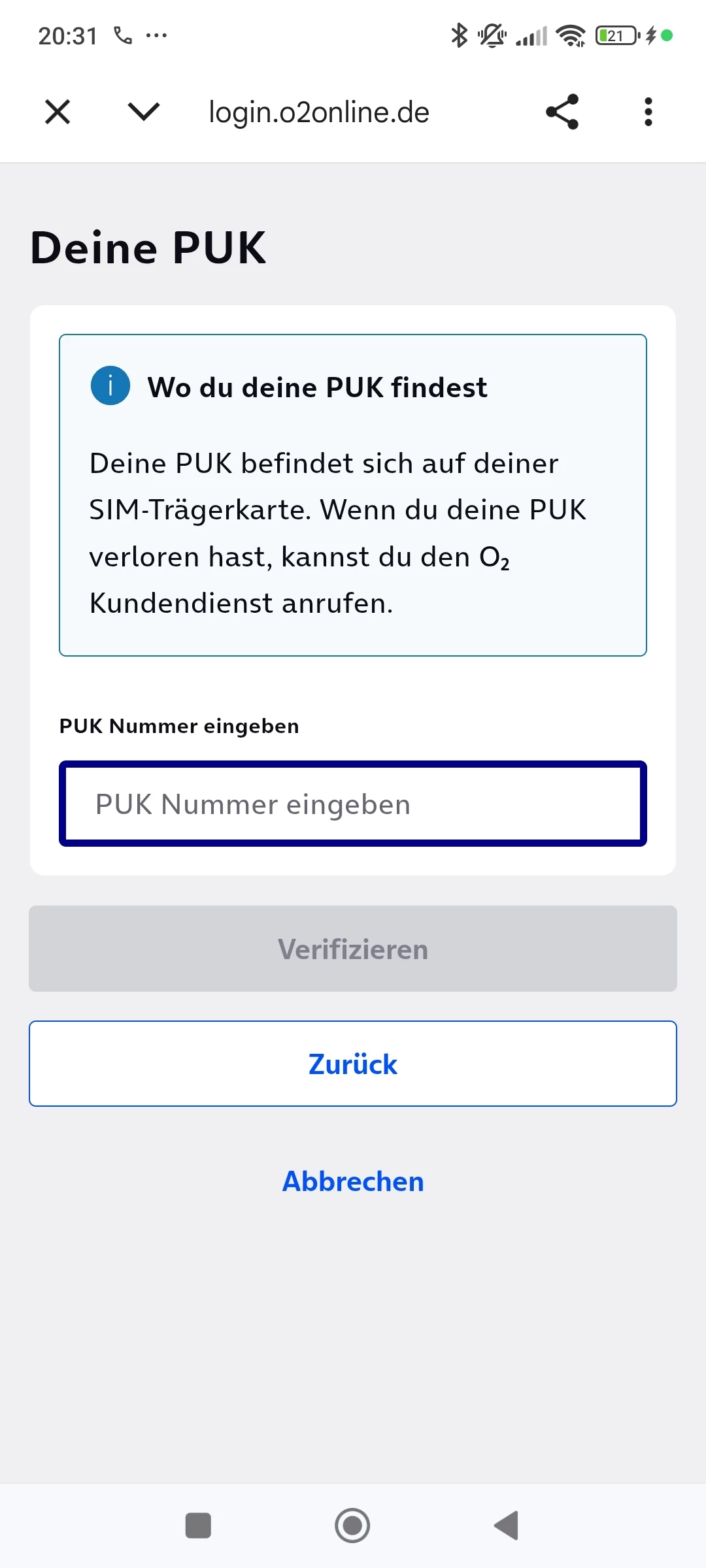 Ich kann mich bei meinO2 nicht anmelden. Ich habe eine neue SIM-Karte, aber die Registrierung funktioniert nicht / ist immer erfolglos. „Ich versuche, mich bei O2 (Mein O2) zu registrieren. Ich bekomme eine SMS und eine E-Mail mit einem Code. Ich gebe alles ein, aber am Ende werde ich wieder auf die Startseite zurückgeleitet. Ich kann mich nicht registrieren. Ist das ein allgemeines Problem oder muss ich etwas anderes machen?