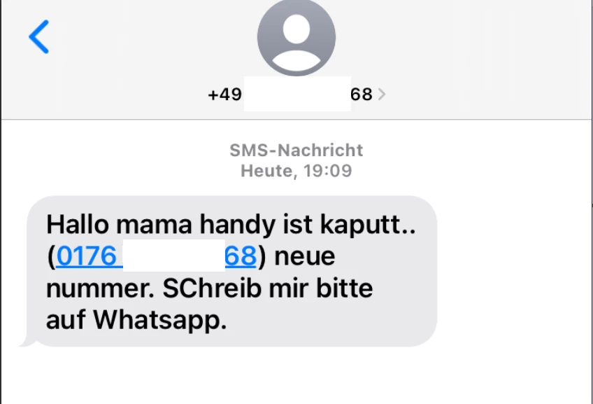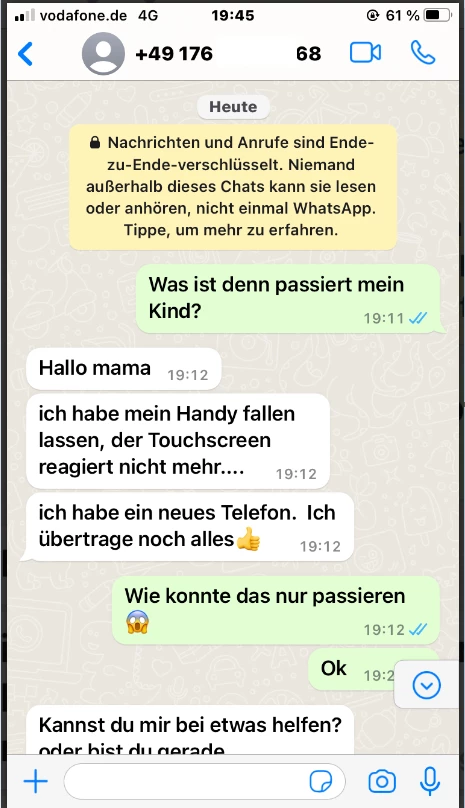 Zu Beginn wird per SMS der Kontakt zu WhatsApp gesucht. Mein mit einem banal Grund (Handy kaputt etc.)