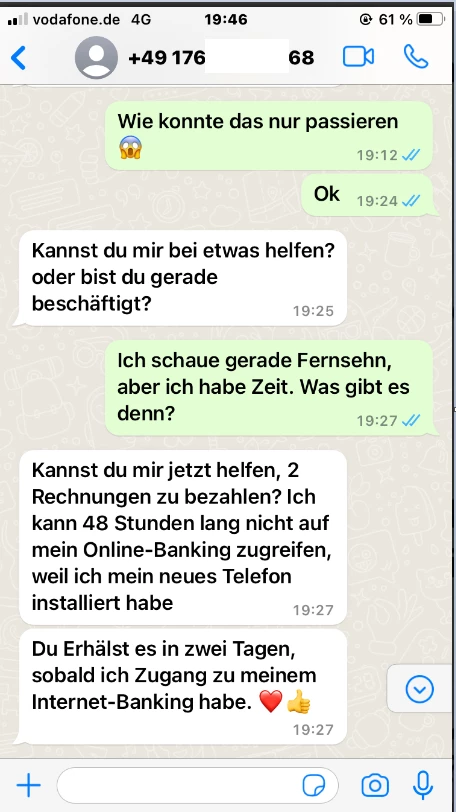 Wenn der Kontakt zu WhatsApp steht, wird nach kurzem Smalltalk nach Hilfe und Begleichung von Rechungen gefragt.