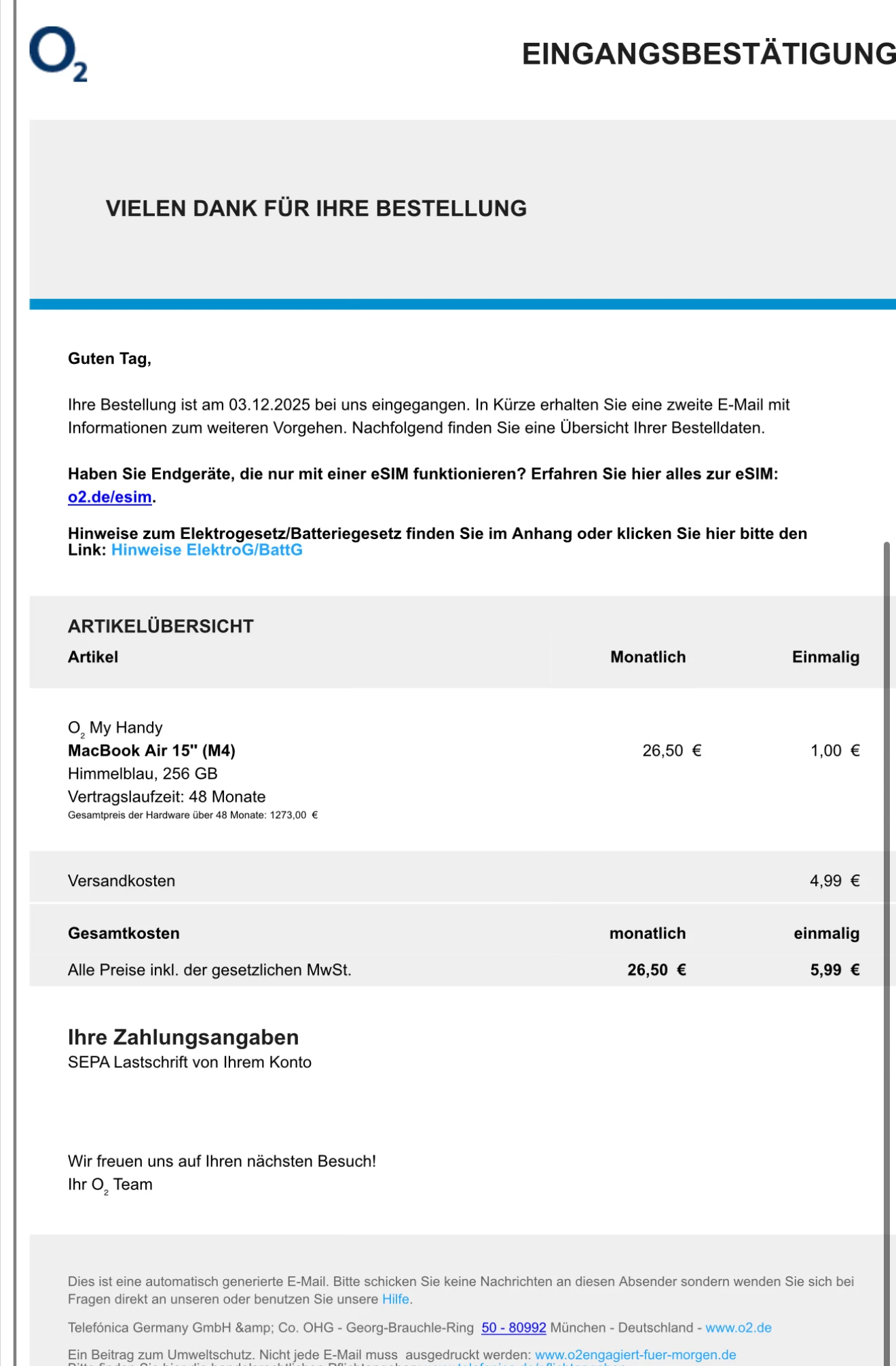 ich habe vor etwa zwei Wochen im Rahmen der Black Week ein MacBook bestellt. Bisher habe ich lediglich eine Bestellbestätigung per E-Mail erhalten. Weitere Informationen, wie z. B. zum Versand oder zur Zahlung, liegen mir bislang nicht vor.