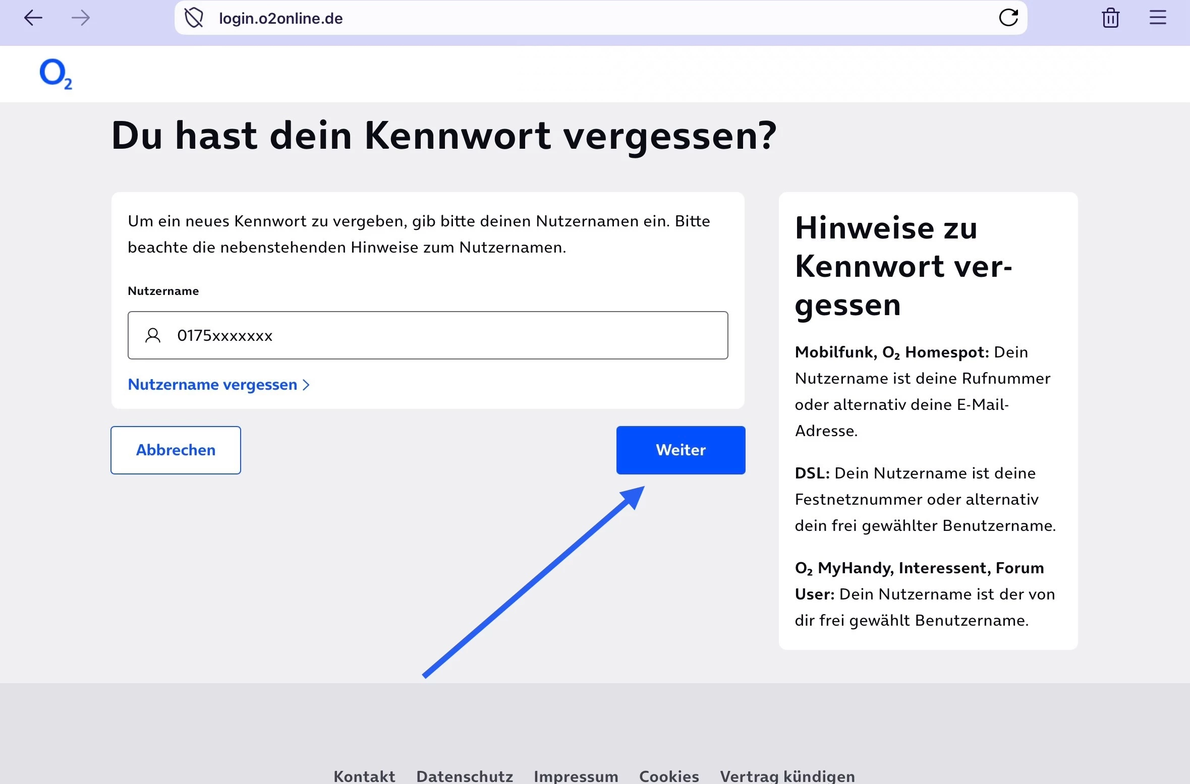 dann kommt die Seite mit dem Kennwort und da gehen wir auf Kennwort vergessen und da kannst du nur den Benutzer eingeben und das ist ja die Rufnummer