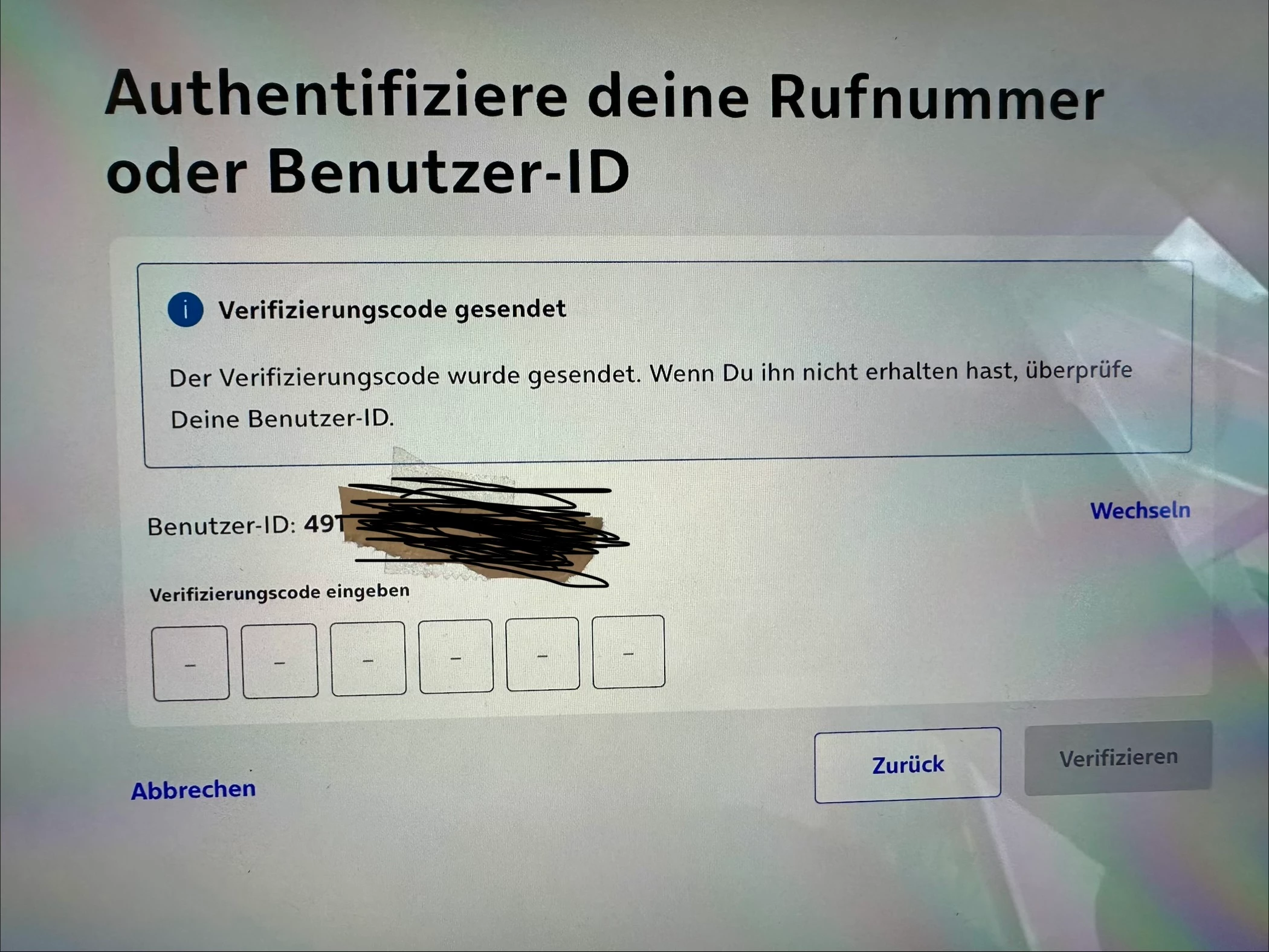 Wir geben die Handynummer als Benutzername ein ein und es kommen keine Verfizierungscodes an. Nummer mit 49… und mit 0 eingegeben aber die Benutzer ID ist immer mit der 49 am Anfang.