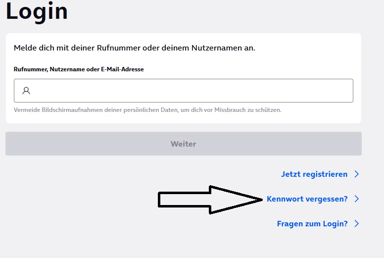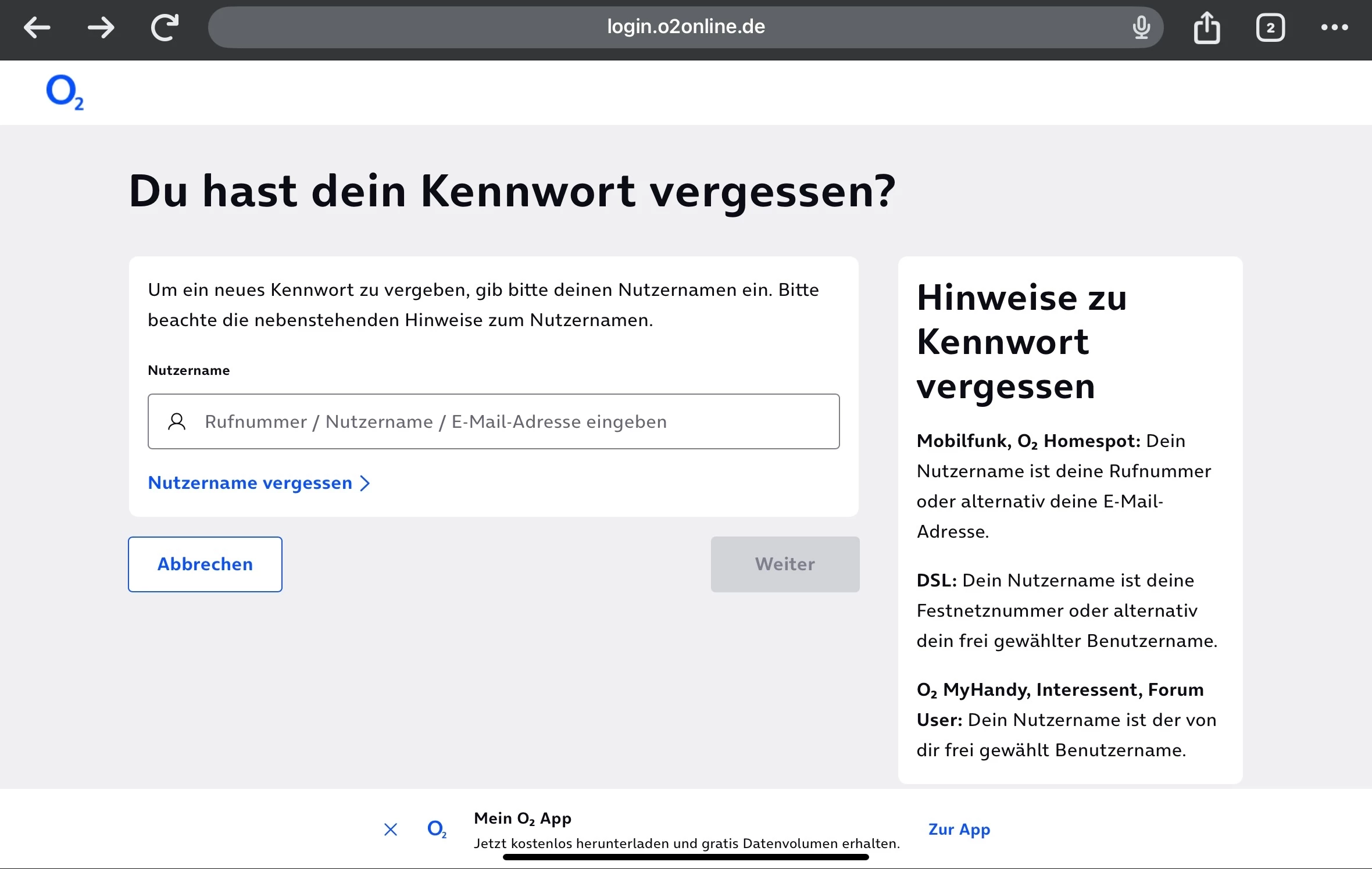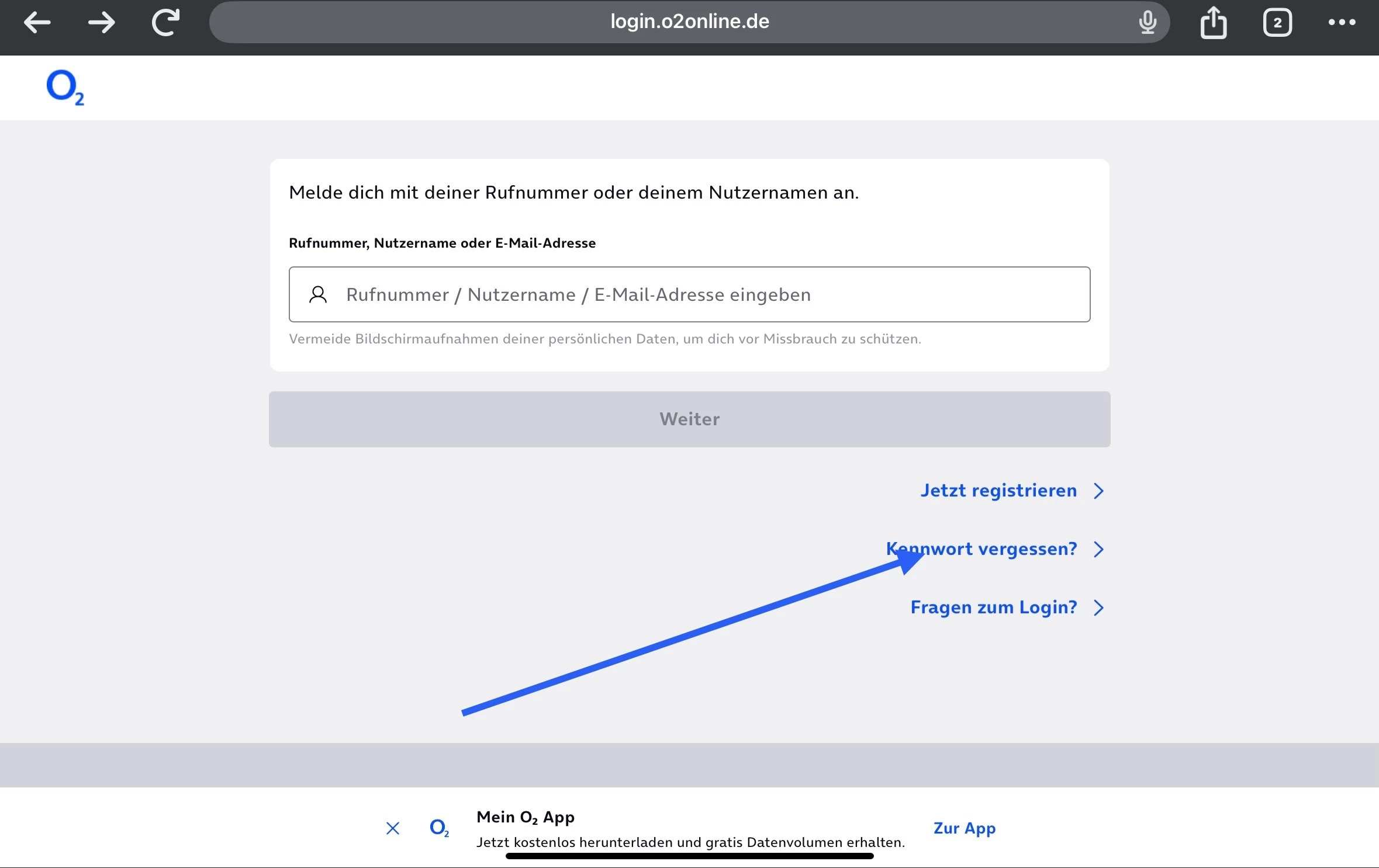 Kennwort vergessen klickst? Der normale Ablauf wäre dann das Kennwort über den Browser neu einzurichten, danach kannst du dich dann in der App mit deiner Rufnummer und deinem neuen Kennwort anmelden.