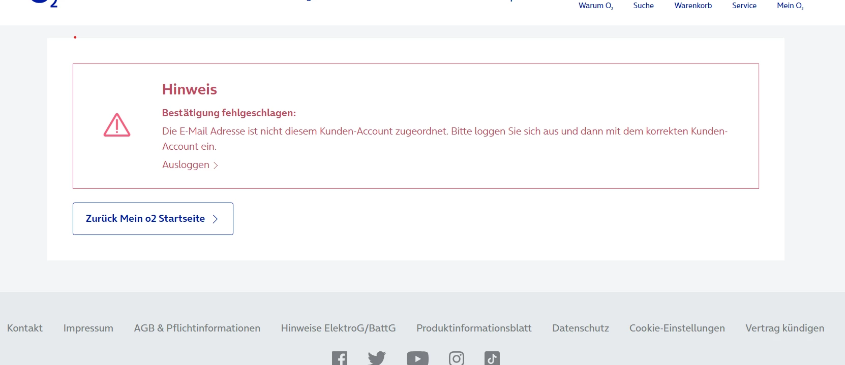 Ich erhalte eine E-Mail, in der ich aufgefordert werde, die E-Mail-Adresse für den neuen Vertrag zu bestätigen, was aber nicht möglich ist, da die Telefonnummer und die E-Mail-Adresse für das Online-Konto von o2 noch mit der Prepaid-Karte verknüpft sind. ( Beide, die Prepaid-Karte und der Vertrag, haben die gleiche E-Mail-Adresse).