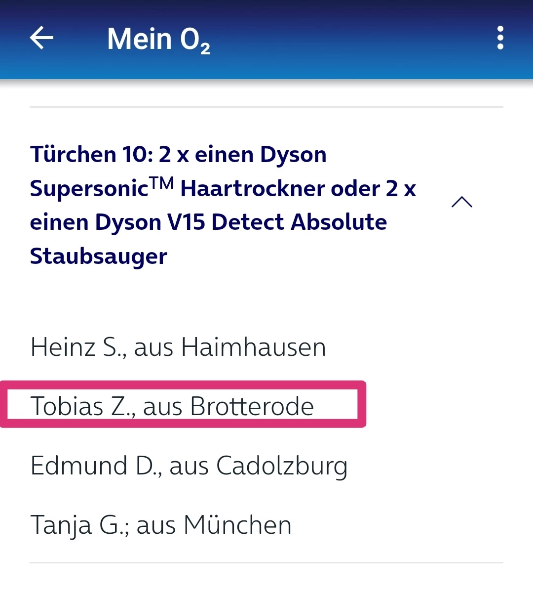O2 Priority Gewinnspiel Gewinner Anzeige