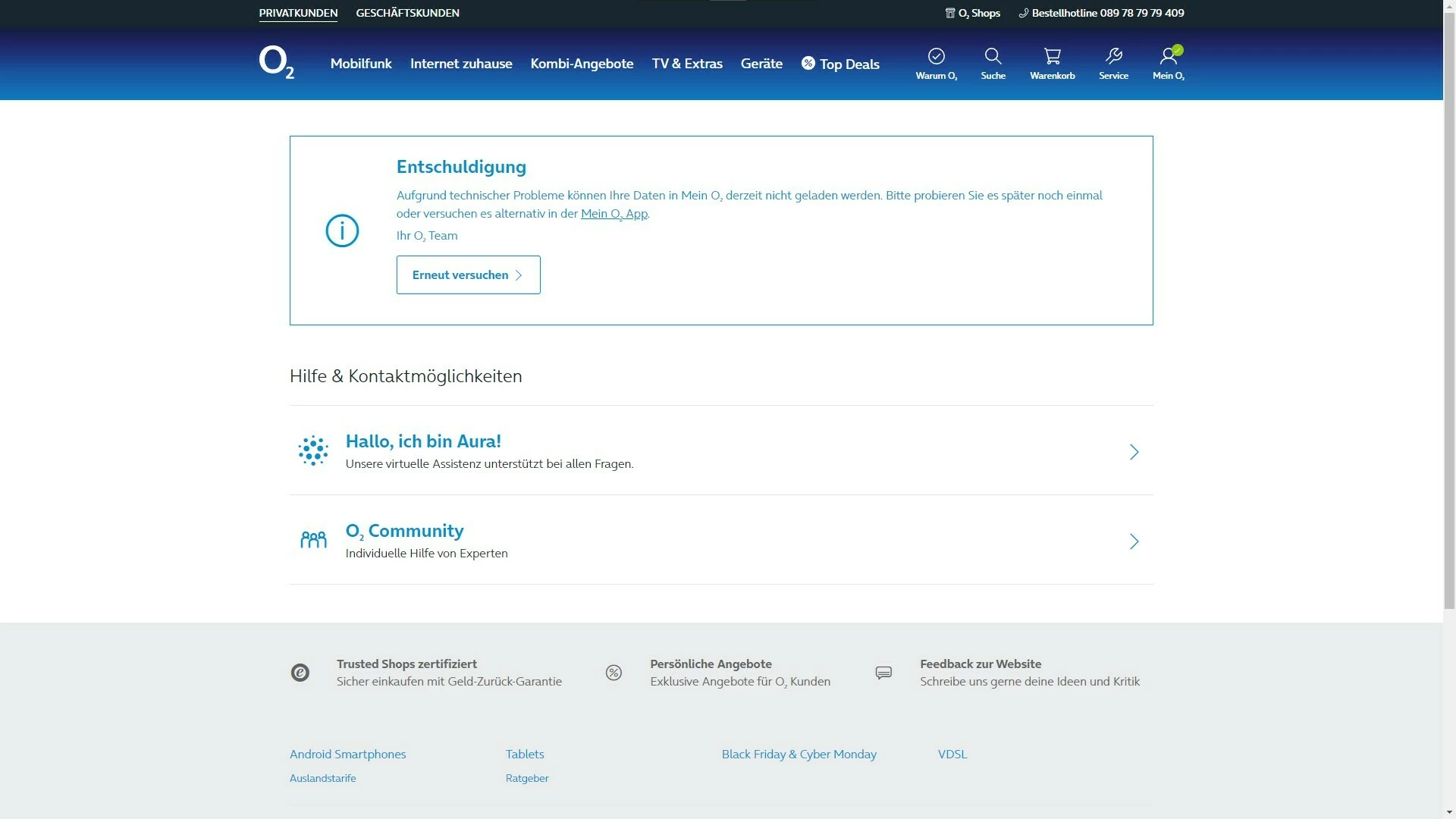 ich habe seit einigen Monaten das Problem, dass ich mich nicht bei der "Mein O2" App anmelden kann (Fehlercode 403) und auch auf der Website meine Daten nicht einsehen kann, weil da steht "Aufgrund technischer Probleme können Ihre Daten in Mein O2 derzeit nicht geladen werden.".