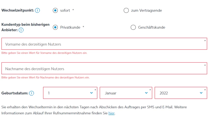 Du kannst dann online eine Rufnummermitnahme beantragen. Wie im Bild angezeigt, trägst du den aktuellen Vertragsinhaber (der Rufnummer die du portieren möchtest) ein.→