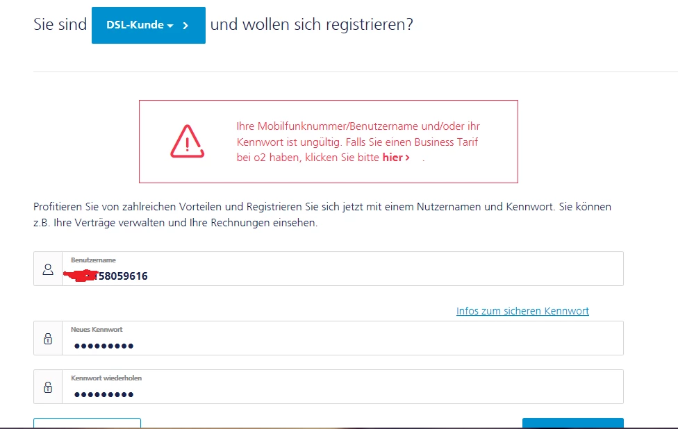 Fehlermeldung: "Ihre Mobilfunknummer/Benutzername und/oder ihr Kennwort ist ungültig. Falls Sie einen Business Tarif bei o2 haben, klicken Sie bitte hier"