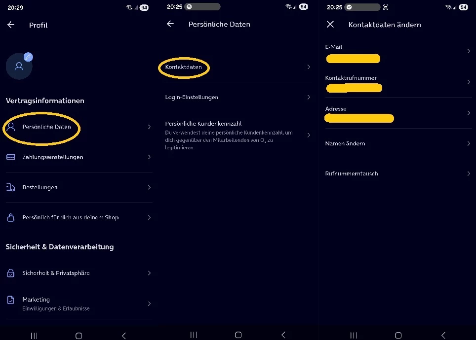 Im Mein o2 Bereich unter persönliche Daten findest du alle deine hinterlegten Daten wie Name, Adresse, E-Mail Adresse, Kontaktrufnummer, Rechnungsadresse und deine Zahlungsdaten. Die Änderung deiner persönlichen Daten kannst du online in deinem Mein o2 Bereich oder in der Mein o2 App vornehmen.