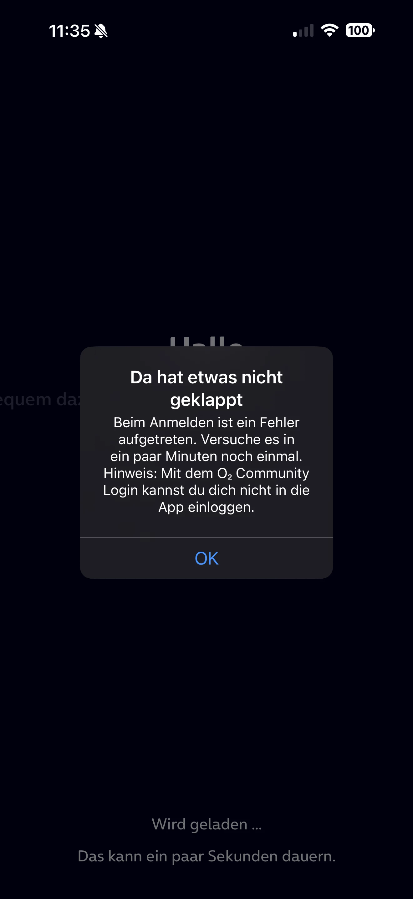 Beim login in die Mein o2 APP kommt welcher Hinweis ?
