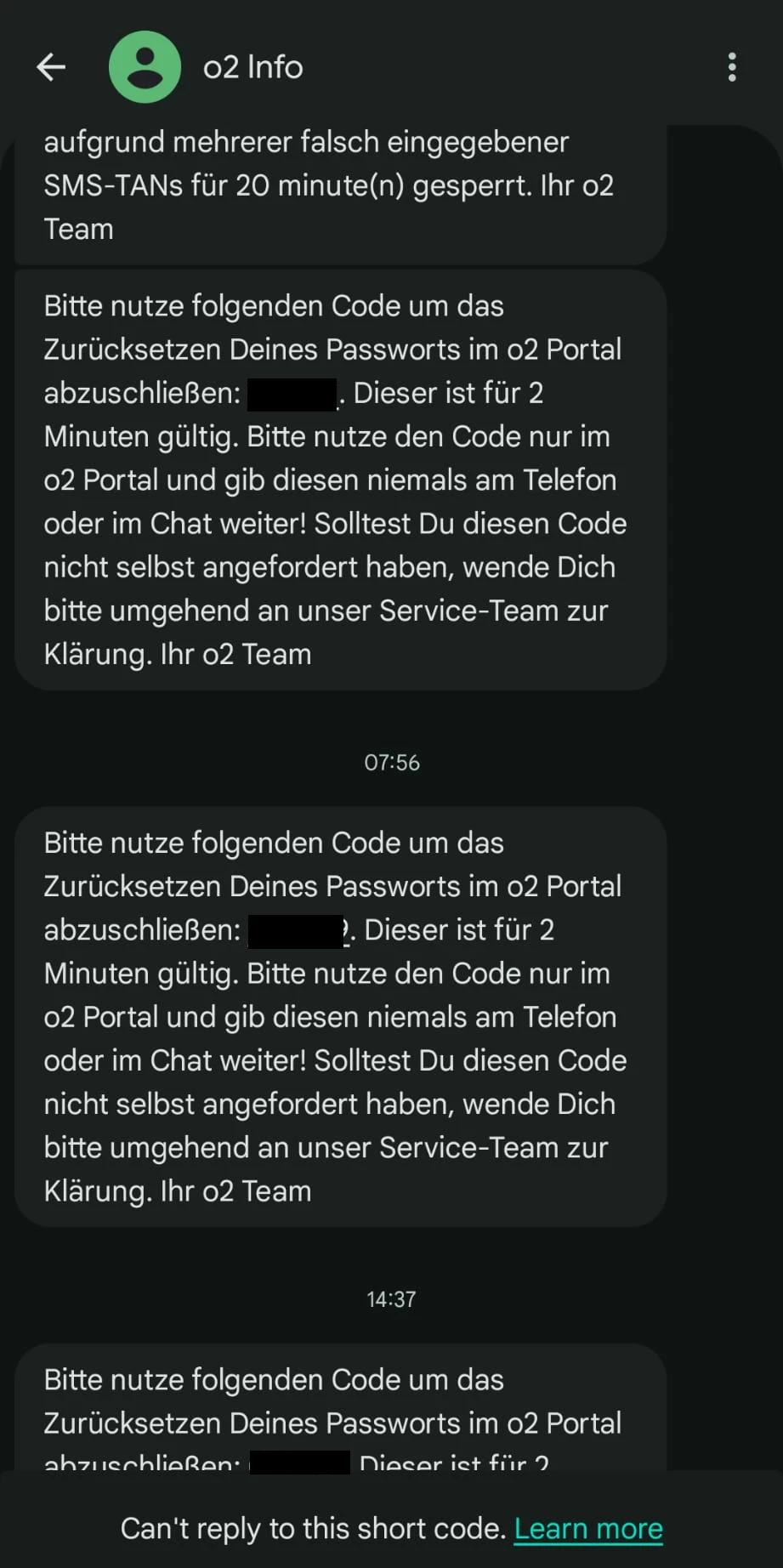 Soweit ich das verstehe, stammen die Nachrichten von o2 selbst. Ich erhalte sie immer noch zweimal täglich. Gestern bekam ich außerdem eine Nachricht, dass mein Konto aufgrund der vielen Anmeldeversuche für 20 Minuten gesperrt wurde. Ich füge sie hier ein (ich vermute, die Codes sind nicht mehr gültig, habe sie aber trotzdem ausgeblendet). Ich wäre für jede Hilfe dankbar. Es beunruhigt mich sehr, dass jemand möglicherweise durch Brute-Force-Angriffe Zugriff auf mein Konto erlangen und mein Passwort ändern könnte.