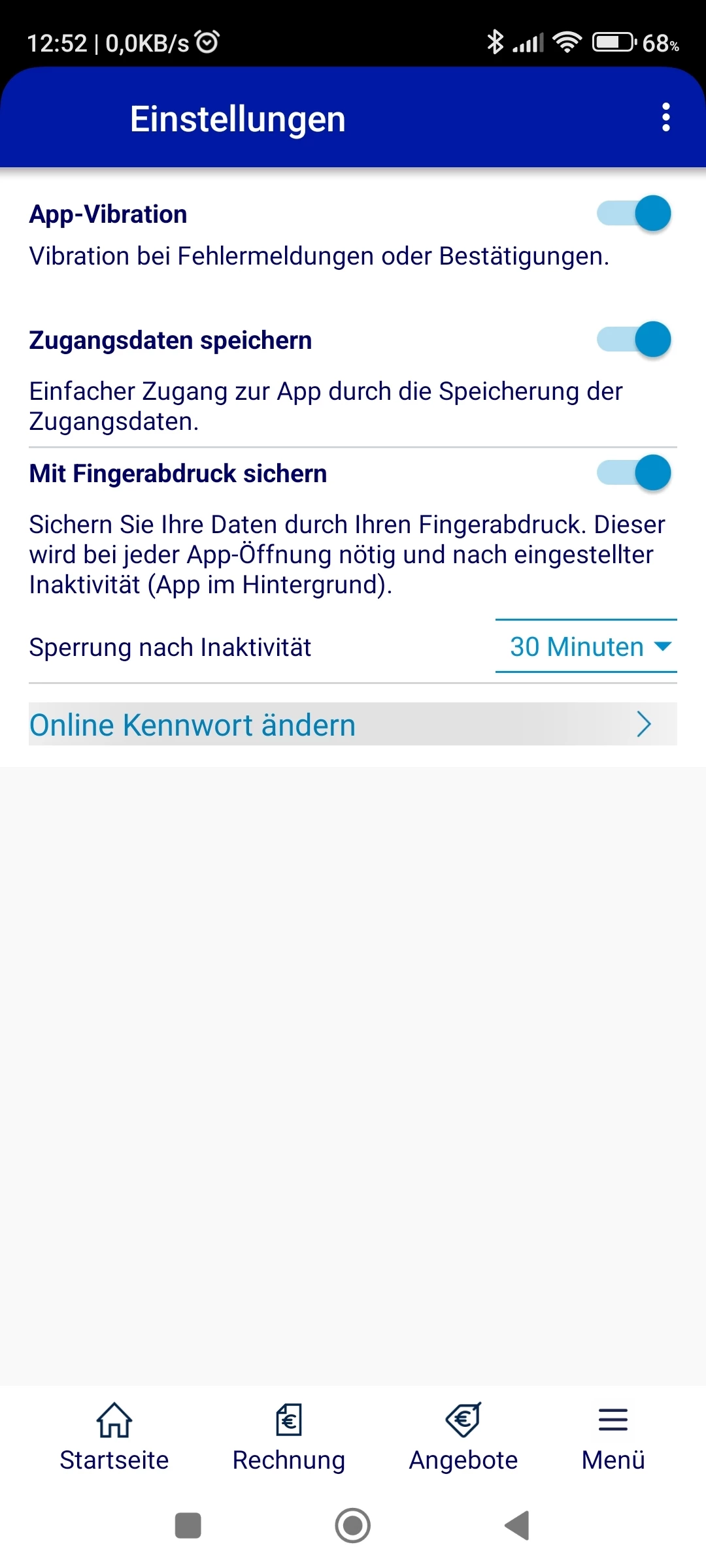 Ich habe in der O2 App "sofort abmelden" versuchsweise eingestellt. Wenn ich in der App online angemeldet bin, verlangt er beim Widget jetzt sogar auch den Fingerprint, obwohl ich in der App noch angemeldet bin. Wenn ich beim Wiget auf "abbrechen gehe" verlangt er beim Einloggen statt Fingerprint das Passwort.