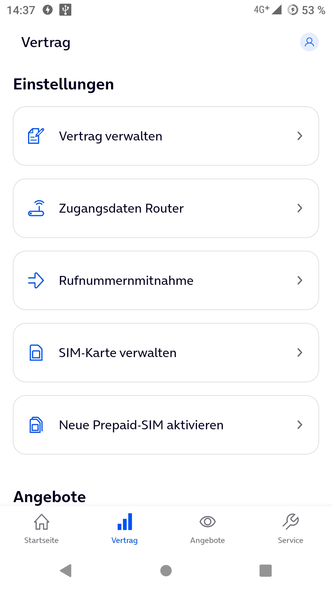 Vertrag - Einstellungen - “Vertrag verwalten”, “Zugangsdaten Router”, “Rufnummermitnahme”, “SIM-Karte verwalten”, “Neue Prepaid-SIM aktivieren”.