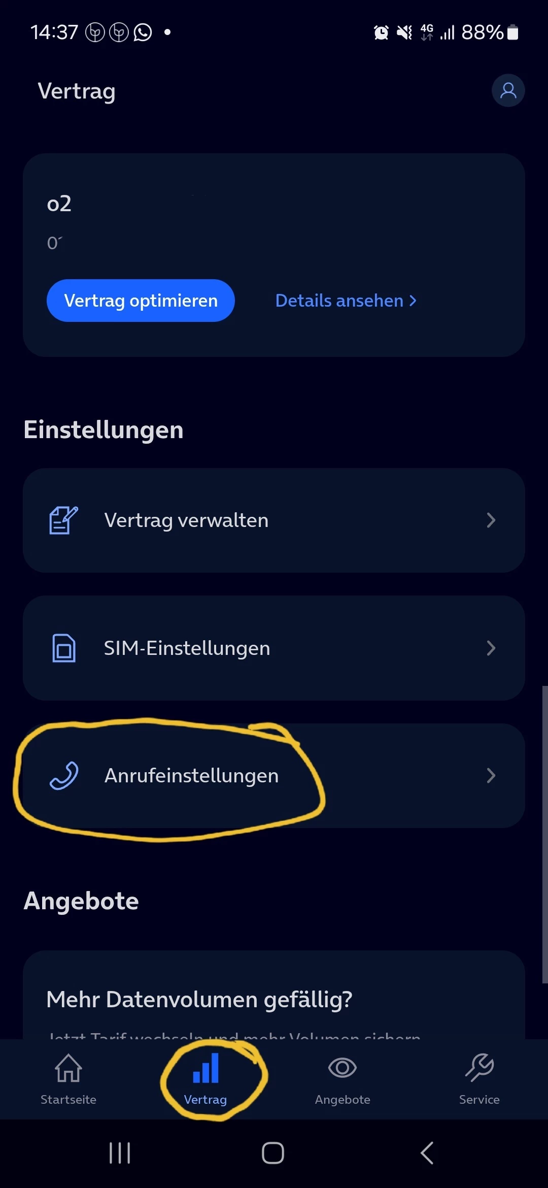 In der Maske unter Vertrag ein bisschen runterscrollen, bis der Punkt Einstellungen erscheint und hier ist Anrufeinstellungen der dritte Punkt. Davor ist ein Kopfhörer-Icon.
