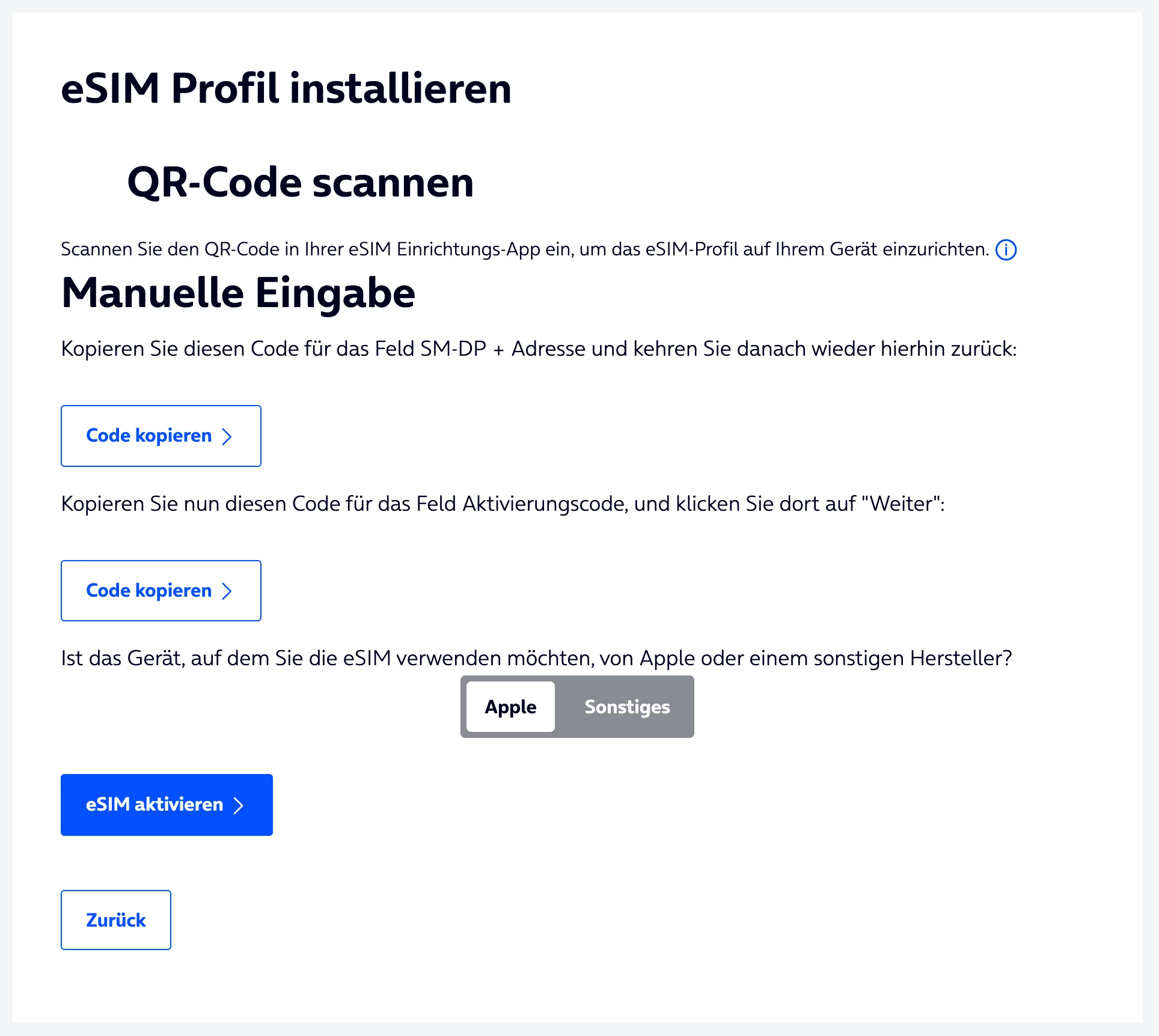 Habe dann trotzdem einen Code gescannt und der wurde in mein Gerät geladen. Allerdings verschwindet dann der Button, um die eSIM korrekt zu aktivieren und die eSIM liegt nutzlos auf dem Gerät und kann keine Verbindung herstellen.