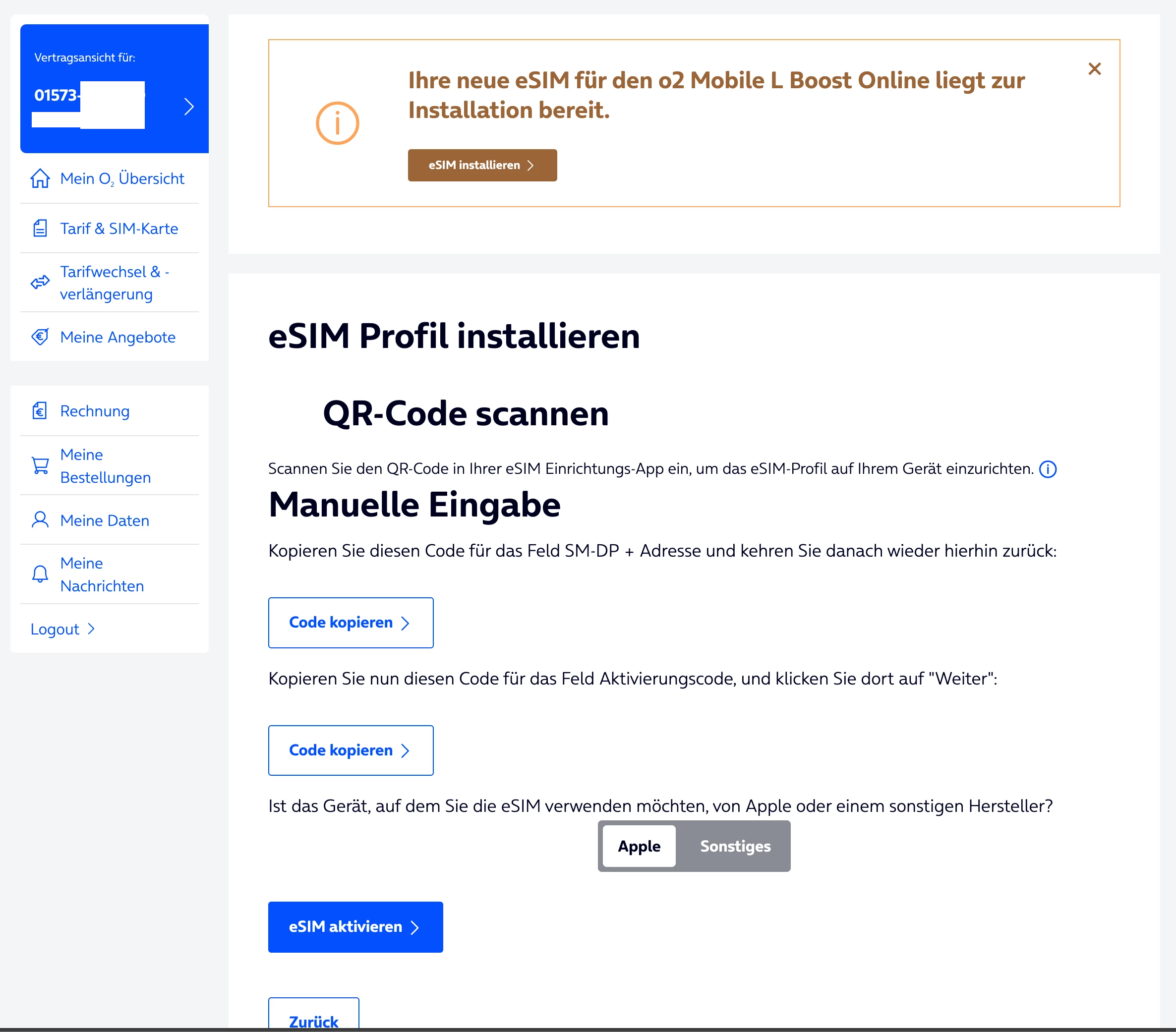 Ich habe es gerade wieder versucht, eine eSIM Karte, die bereits vor Wochen bestellt wurde, in ein Gerät und laden und dann zu aktivieren! Es macht mich mittlerweile regelrecht aggressiv, wie schlecht das o2 Portal funktioniert! Zuerst wird mir auf der Seite, wo der eSIM QR Code gescannt werden kann, weder der QR Code noch Nummern zur manuellen Eingabe angezeigt, weil die Darstellung des Portals es einfach nicht hinkriegt! Gehe ich dann über den Banner (orange/bräunliche Farbe), der auf der Startseite, nach dem Login im Portal kommt, wird mir der QR Code plötzlich angezeigt, aber ich weiss bei mehreren bestellten eSIM Karten nicht, für welches Gerät diese SIM Karte dann gilt.