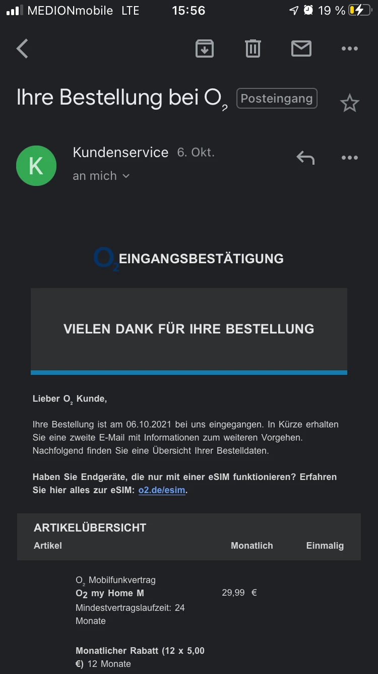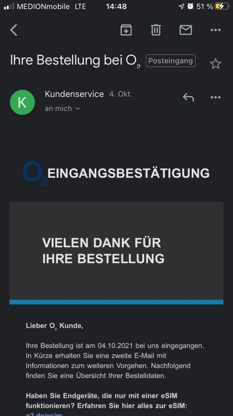 Oh ja, sorry, 04.10.2021 habe ich mit falschen Konto bezahlt.  Am 06.10.2021 war die Bestellung korrekt und ich erhielt eine E-Mail mit der Auftragsnummer. Zuerst bekam ich diese E-Mail, dann die E-Mail mit Auftragsnummer.