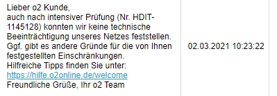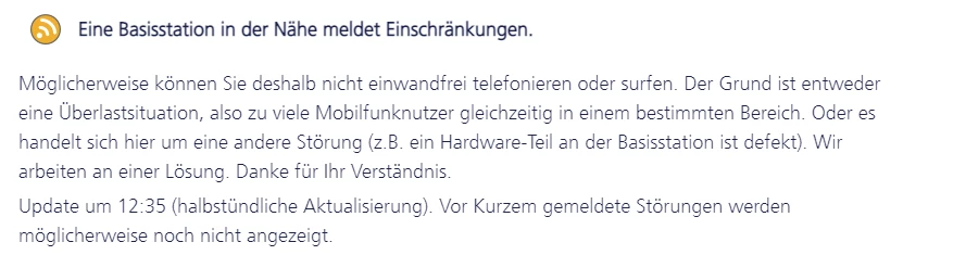 Einschränkungen können auch durch eine Überlastsituation hervorgerufen werden, beispielsweise, dass sich gerade besonders viele Nutzer in eine Funkzelle einwählen oder aus einer benachbarten Zelle herüberschwenken, weil es dort zu einem Ausfall gekommen ist. Das bedeutet nicht, dass es sich in diesem Moment um ein technisches Problem an der genutzten Basiststation handelt. Daher hast du die Benachrichtigung erhalten, dass es keine technische Beeinträchtigung des Netztes gibt.