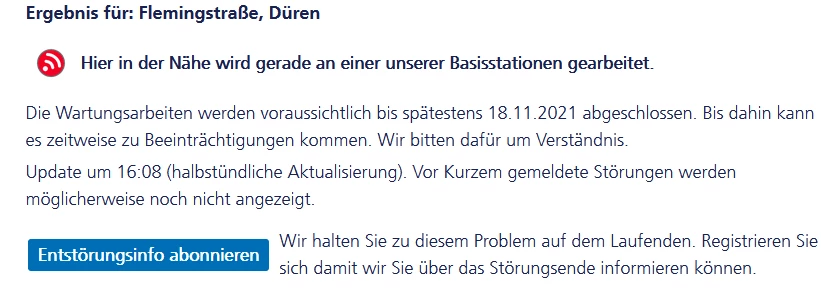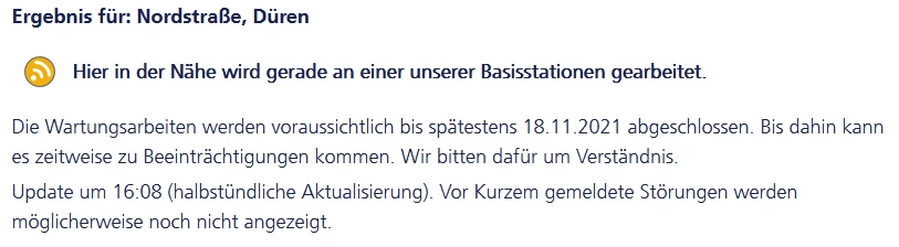 Wenn man sich die Netzabdeckungskarte anschaut, dann sieht man, dass es dort mehrere Basisstationen gibt. Auch steht dort, dass an einer der Basisstationen gearbeitet wird. Auch ist für den Ort ein Abschlussdatum zu morgen (18.11.) angegeben. Es reicht nicht aus, wenn man nur nach einer Ortschaft oder PLZ sucht. Es kann auch schon eine fehlende Hausnummer zu einem falschen Ergebnis führen.