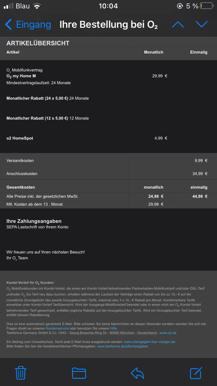 in der Willkommen-email wird das erste Mal erwähnt, dass 50€ scheinbar als Einmalzahlung für den o2 Homespot fällig sind. Das bringt mir aber auf gut deutsch n scheiß wenn das zwischen 5 emails versteckt ist und man erst nach Vertragsschluss erfährt, dass eine weitere Zahlung fällig ist. Widerrufsfrist ist natürlich auf vorbei dann wohl wenigstens direkt wieder kündigen. Das wird doch mit Absicht so gemacht. Warum stehen die 50€ nicht auf der Auflistung in der Bestellbestätigung ? Sie soll doch zusammenfassen was mich für Kosten erwarten.