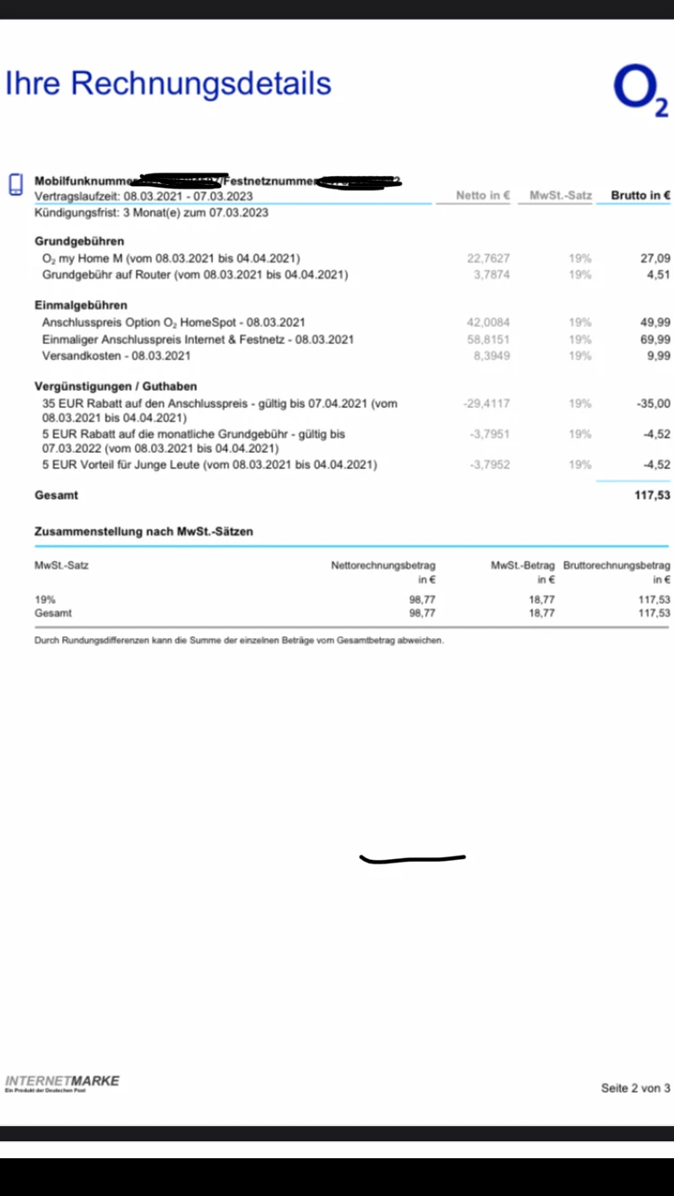 ich bin ein wenig verärgert. Ich habe vor ein paar Wochen einen o2 Homespot M Vertrag abgeschlossen und heute die erste Rechnung erhalten. Ich habe den Vertrag nur zu diesem Zeitpunkt abgeschlossen, da mit 50% Rabatt auf den Anschlusspreis geworben wurde (35€ statt 70€).