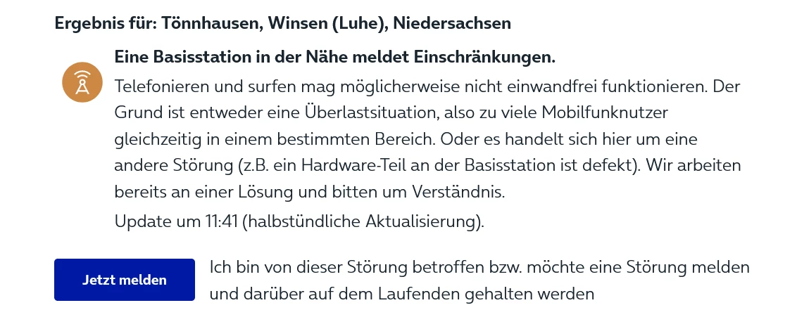 Laut der O2 Störungsseite hat eine Basisstation in meiner Nähe ein Problem.