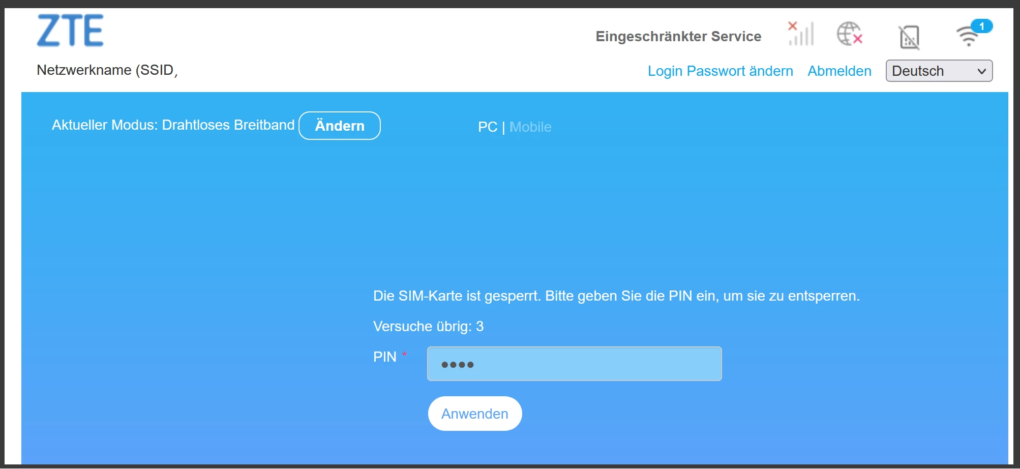 SIM Karte ist entsperrt. Ich habe jetzt noch die SIM Abfrage deaktiviert und den Router nochmal neu gestartet.