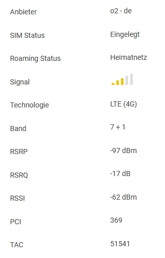 genau habe die Externe Antenne ausgeschaltet (auf Intern geschaltet) Es ist eine Jarft Antenne mit den dazu gehörigen LTE Kabel. Router steht erhöht mit Blickrichtung zum Fenster. Signal verbessert sich nicht, wenn der Router direkt ans Fenster gestellt wird. Hoffe es bleibt so.