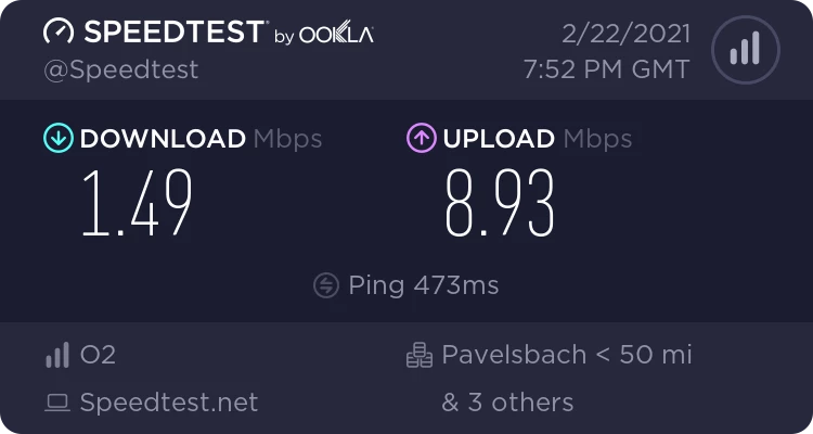 Hi @o2_Kurt ! Danke fuer die Antwort. Ganz ehrlich bin ich im Moment am Verzweifeln!!!! Abends zwischen 21 bis 22 Uhr ist seit ein paar Tagen tote Hose. Ich habe schon eine Stoerung gemeldet, dass eNB ID 81152 “spackt”. Das Ergebnis ist das gleiche, wie du schreibst.